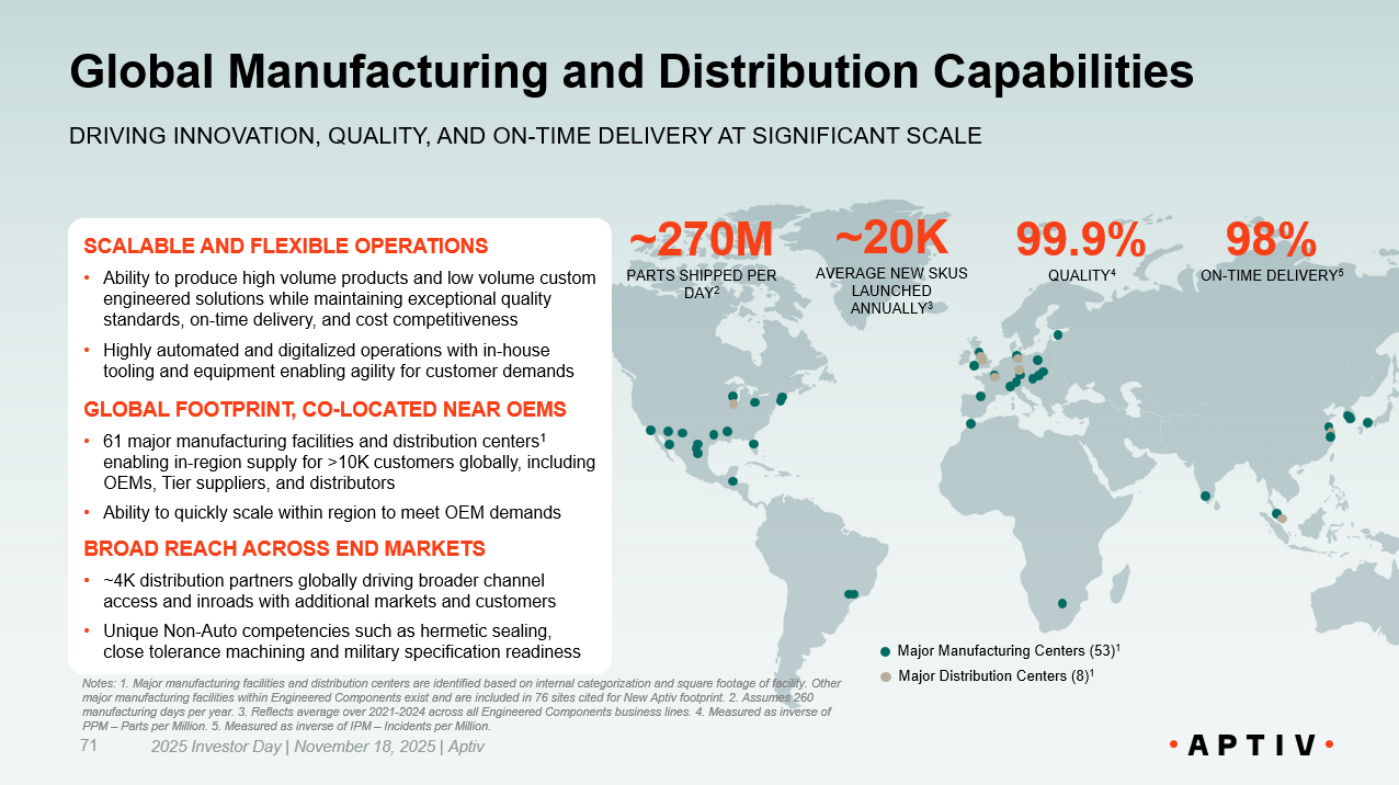 全球制造和分销能力推动创新、质量和在大规模主要分销中心的准时交付(8)199.9%质量4~20k平均新SKUS每年推出398%的准时交付5注:1。主要制造设施和配送中心是根据设施的内部分类和方形FIO tage来确定的。Engineered Components内存在其他主要制造设施,并包含在76个因新的Aptiv足迹而被引用的站点中。2.假设每年260个制造天数。3.反映了所有工程组件业务线2021-2024年的平均值。4.测量为PPM的反比–百万分之。5.衡量为IPM的反比–每百万的事件。~每天出货2.7亿件零件2可扩展且灵活的操作• Ability以生产大批量产品和小批量定制工程解决方案,同时保持卓越的质量标准、准时交付和成本竞争力•高度自动化和数字化的操作,内部工具和设备能够灵活地满足客户需求全球足迹、CO-位于主机厂附近• 61个主要制造设施和配送中心1,能够为全球超过1万家客户(包括主机厂、一级供应商、和分销商•在区域内快速扩展以满足OEM需求的Ability遍布终端市场•~全球范围内的4K分销合作伙伴推动更广泛的渠道准入并通过更多的市场和客户打入•独特的非汽车竞争力,例如密封密封加工、密差加工和军用规格准备712025投资者日| 2025年11月18日| Aptiv主要制造中心(53)1
