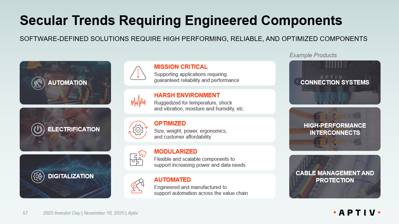 HEATSHRINK Protective Tubing…用于恶劣环境中的系统保护,例如航空航天和海底应用HERMETIC & RF1连接器…用于需要环境密封和射频连接的高性能接口的应用…用于需要高速度和/或高功率使能解决方案的应用,以感知、思考、行动,优化2025投资者日| 2025年11月18日| Aptiv 58套高性能和成本综合套件-有效的解决方案连接系统和接口,使设备和系统能够……跨所有行业高完整性地传输数据到在整个电气架构中高效集成电源和数据,为边缘设备传感器提供信号和功率SENSE THINK ACT Optimize注:1。RF –无线电频率。为更多的信号和功率设计组件,同时保持更小、更轻、具有成本效益的示例产品