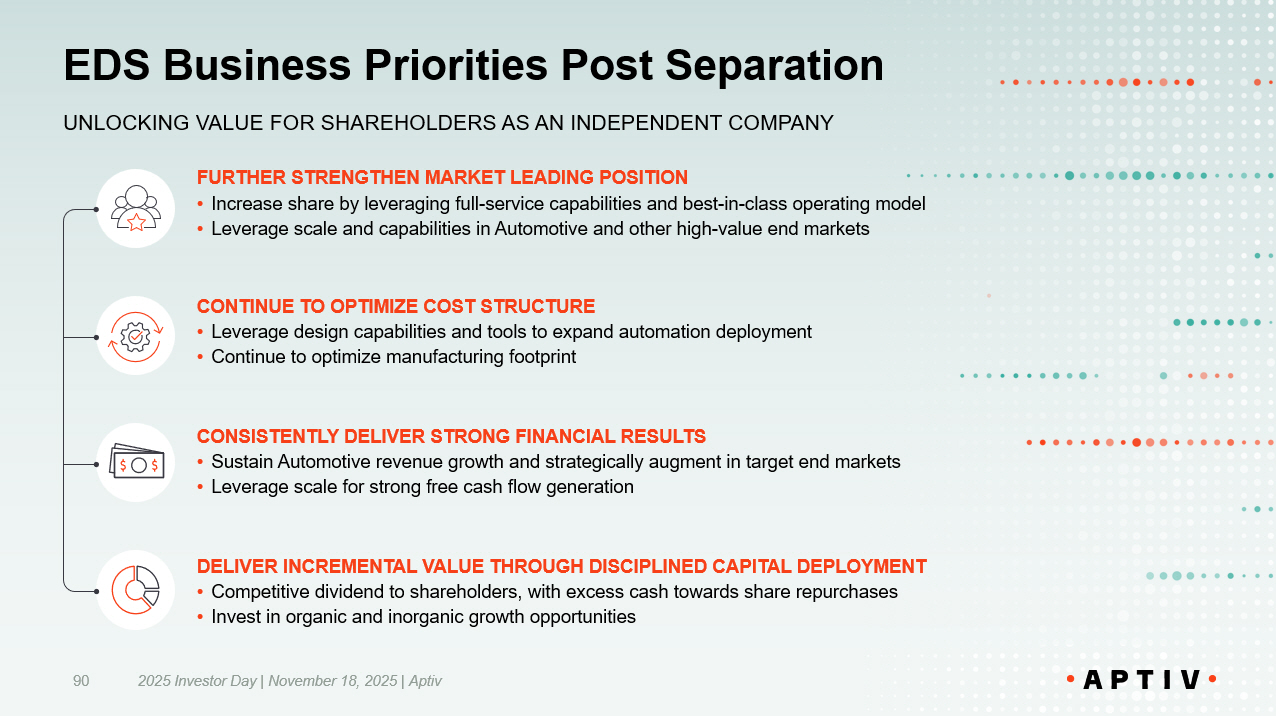 90个EDS业务优先事项发布分离后股东作为独立公司的解锁价值2025投资者日| 11月18日,2025 | Aptiv进一步加强市场领先地位•通过利用全方位服务能力和一流的运营模式提高份额•利用汽车和其他高价值终端市场的规模和能力不断带来强劲的财务业绩•维持汽车收入增长并在目标终端市场进行战略增强•利用规模产生强大的自由现金流继续优化成本结构•利用设计能力和工具扩大自动化部署•继续优化制造足迹通过有纪律的资本部署带来增值•为股东提供有竞争力的红利,将多余的现金用于股票回购•投资于有机和无机增长机会