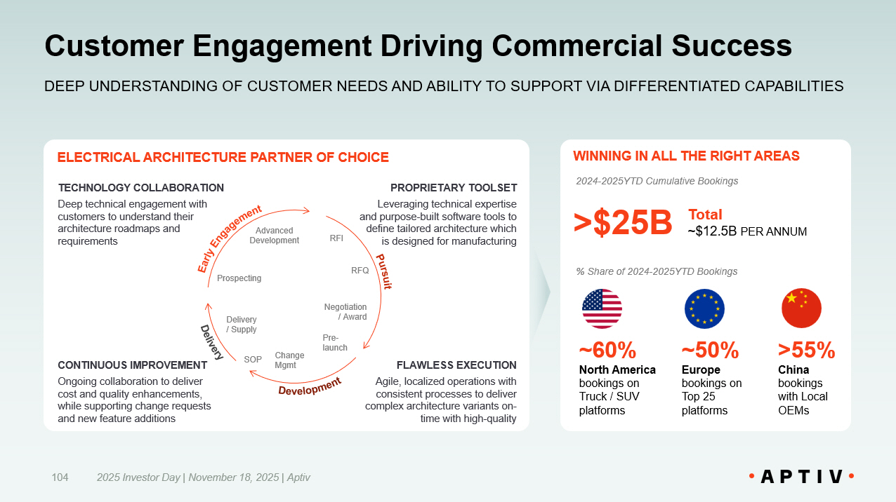 客户参与推动商业成功2025投资者日| 2025年11月18日| Aptiv 104深入了解客户的需求和支持能力,通过在所有正确领域获胜的差异化能力2024-2025年年初至今累计预订量总计~每年$ 12.5b > 2024-2025年年初至今的$ 25b %份额预订量~60%卡车/SUV平台的北美预订量~前25大平台的50%欧洲预订量> 55%中国与当地主机厂的预订量CHOICE Prospecting Advanced Development RFI RFQ谈判/授予上市前变更以一致的流程进行本地化操作,以高质量持续改进的方式按时交付复杂的架构变体持续协作,以提供成本和质量增强,同时支持更改请求和新增功能技术协作与客户进行深入的技术接触,以了解他们的架构路线图和需求专有工具集利用技术专长和专门构建的软件工具来定义专为制造而设计的定制架构