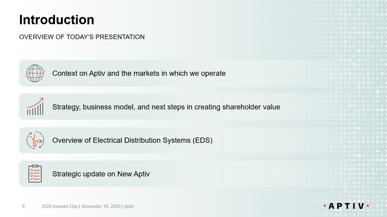 导语2025投资者日| 2025年11月18日| Aptiv 6今天关于Aptiv和我们经营所在市场的介绍背景概览战略、商业模式以及创造股东价值的下一步工作电气分配系统(EDS)战略更新概览关于新的Aptiv
