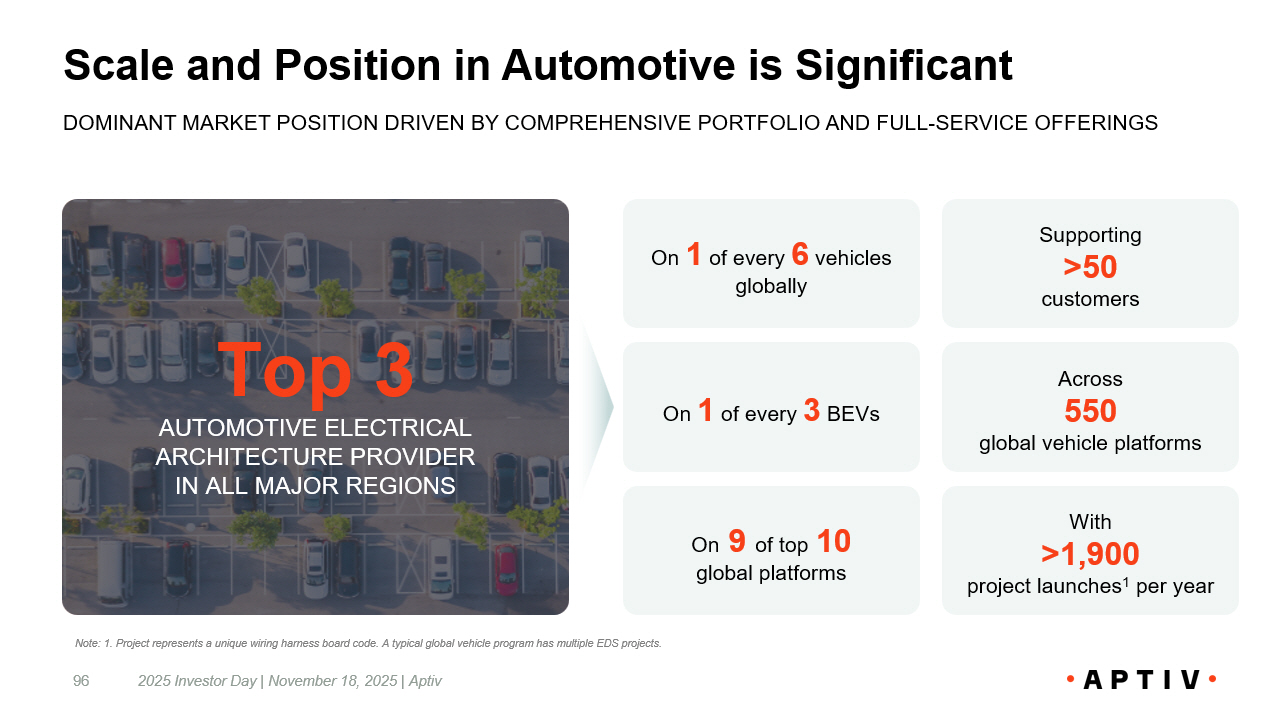 汽车领域的规模和地位意义重大2025投资者日| 2025年11月18日|由综合投资组合和F ULL驱动的Aptiv 96个主导市场地位-服务产品在全球10大平台中的9个平台上拥有超过1,900个项目,每年在550个全球车辆平台上每3辆BEV中就有1辆在全球每6辆车中就有1辆支持> 50个客户注:1。Project代表一种独特的线束板代码。一个典型的全球汽车项目有多个EDS项目。