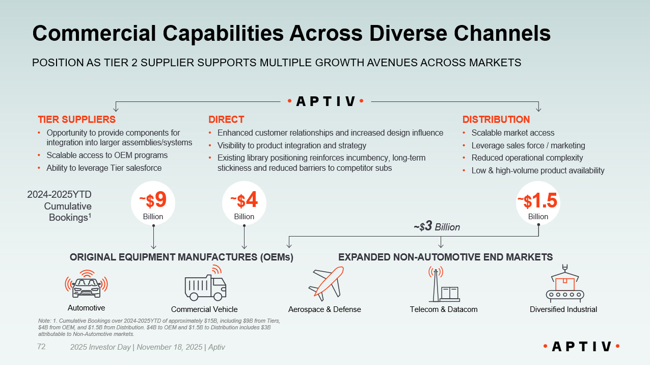 跨多个渠道的商业能力作为二级供应商的地位支持跨市场的多个增长渠道直接•增强客户关系和增加设计影响力•产品整合和战略的可见度•现有的库定位加强了在位能力,长期粘性并降低竞争对手次级供应商的壁垒•有机会为集成到更大的组件/系统中提供组件•可扩展的OEM计划访问权限•利用层级销售人员分配的Ability •可扩展的市场准入•利用销售人员/营销•降低运营复杂性•产品可用性低且高产量汽车商用车原始设备制造商(OEM)数十亿美元~9美元扩大的非汽车终端市场电信和数据通信多元化工业航空航天和国防2024-2025YTD累计预订量10亿~40亿美元~1.57 22025年投资者日| 11月18日,2025 | Aptiv注:1。2024-2025YTD的累计预订量约为$ 15B,其中$ 9B来自Tiers,$ 4B来自OEM,$ 1.5B来自Distribution。OEM的$ 4B和Distribution的$ 1.5B包括归属于非汽车市场的$ 3B。~30亿美元
