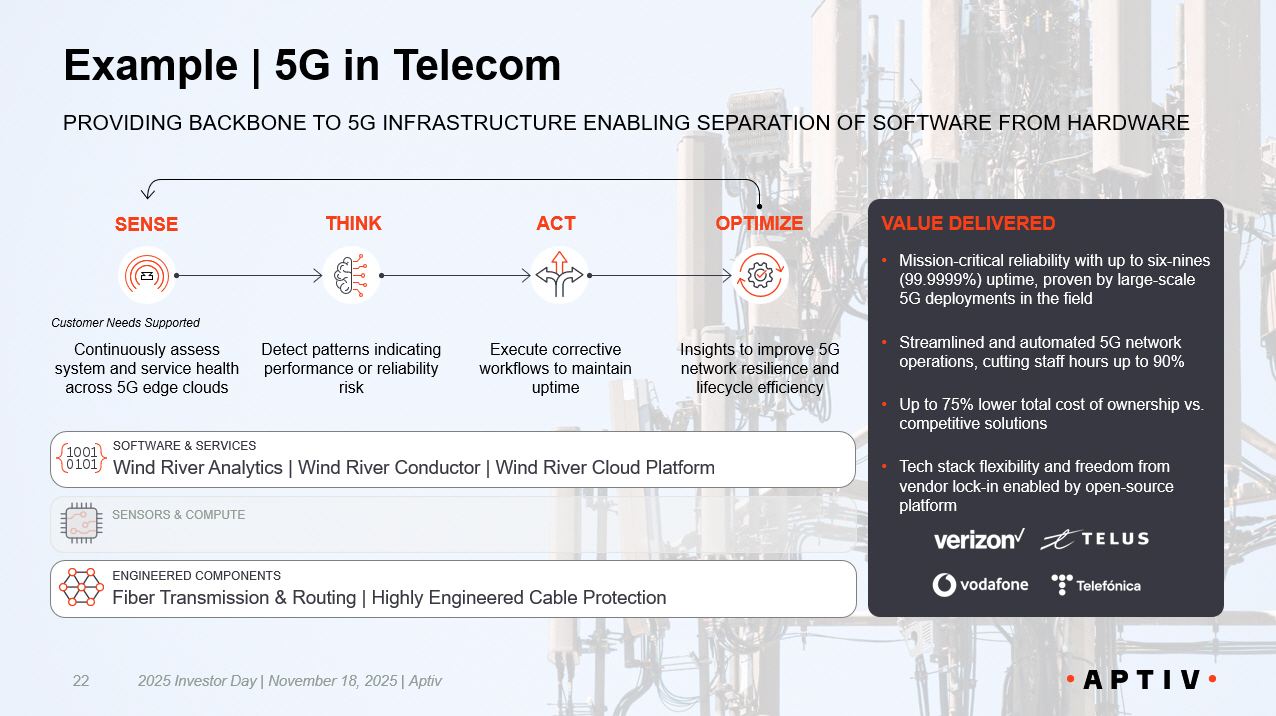 44示例| 5G vRAN和O-RAN电信更高的网络可靠性和更大的灵活性,以更低的总拥有成本交付在开放平台上运行的6-NINES UPTIME轻松可定制的解决方案,由深度系统集成、测试和验证能力支持,在全球范围内运行于Wind River技术的小区站点90K +与竞争解决方案相比,更低的总拥有成本高达75% 99。9999%可靠性,~0宕机,经大规模5G部署应用程序和AI模型Wind River Analytics验证,用于检测网络性能或可靠性风险,并将纠正性工作流云工具Wind River Cloud Platform识别为支持大规模5G网络的分布式云基础设施云工具Wind River Conductor,用于跨5G网络部署、更新和维护应用程序和基础设施,一边用“零接触”自动化编排第2天的运营任务,一边在全球范围内进行第1次端到端全虚拟化5G数据会话应用& AI模型Wind River Analytics实时了解5G边缘云基础设施的健康状况SENSE THINK Optimize Act 2025投资者日| 2025年11月18日| Aptiv甄选5G客户