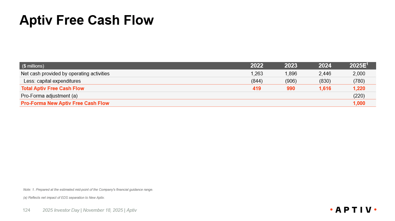 Aptiv自由现金流2025年投资者日| 2025年11月18日| Aptiv 124注:1。在公司财务指导区间的预估中点编制。(a)反映EDS分离对新的Aptiv的净影响。2025E 1202420232022(百万美元)2,0002,4461,8961,263经营活动提供的现金净额(780)(830)(906)(844)减:资本支出1,2201,616,990419总Aptiv自由现金流(220)备考调整(a)1,000备考新的Aptiv自由现金流