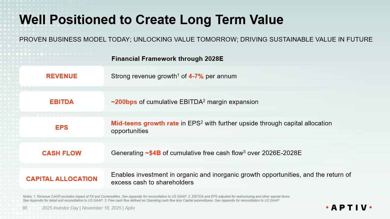 EPS 2处于十几岁的增长率,通过资本配置机会进一步上行,在2026年至2028年期间产生约4B美元的累计自由现金流3使得能够投资于有机和无机增长机会,并向股东返还超额现金约200bps的累计EBITDA 2利润率扩张强劲的收入增长1为每年4-7% 2025年投资者日| 2025年11月18日| Aptiv 86到2028年的收入EBITDA EPS现金流资本分配财务框架注:1。收入复合年增长率不包括外汇和大宗商品的影响。与美国公认会计原则的对账见附录。2.EBITDA和EPS a dju sted for restructuring and other special items。有关详细信息以及与美国公认会计原则的对账,请参见附录。3.自由现金流定义为经营现金流减资本支出ure s。有关与美国公认会计原则的对账,请参见附录。有能力创造长期价值今天证明的商业模式;明天解锁价值;推动未来的可持续价值