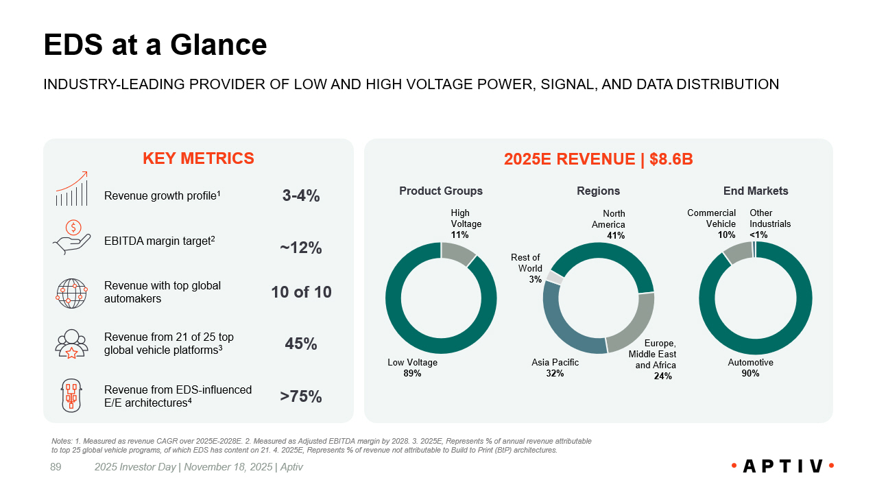 2025E收入| $ 8.6B关键指标EDS概览2025年投资者日| 2025年11月18日| Aptiv 11个低压和高压信号、电源和数据分发解决方案的领先提供商来自EDS影响的E/E架构的收入2 > 75%来自25个全球顶级汽车平台中的21个平台上的内容的收入145%来自全球顶级汽车制造商的收入10个全球制造工厂中的10个全球制造工厂76小时成本最高国家的劳动力95%低压89%高压11%北美41%欧洲,中东和非洲24%亚太地区32%世界其他地区3%汽车90%商用车10%其他工业< 1%产品组地区终端市场注:1。2025E,代表年度收入归属于top25全球车辆方案的百分比,其中EDS有内容于21。2.2025E,代表不归属于Build to Print(BTP)架构的收入百分比。