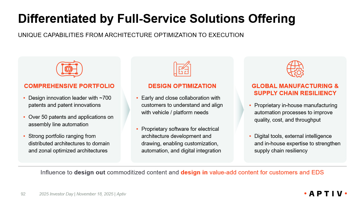 长期趋势需要更稳健的解决方案趋势需要先进的架构解决方案和强大的供应商能力91对架构供应商的业务要求自动化电气数字化全球规模和弹性供应链•为所有区域的全球平台以相同的质量为客户提供相同的产品•本地化制造和有弹性的供应链,以减轻地缘政治风险并确保供应端到端能力的一致性•提供与客户的早期互动,以了解精确的需求和要求•提供从组件到全系统的解决方案针对电气架构的性能和成本产品要求进行了优化优化为客户优化设计支持尺寸、重量、功率和成本节省需要保证可靠性和性能的MISION关键支持系统2025投资者日| 2025年11月18日| Aptiv先进的功能支持使能能够转向xEV和更高的ADAS、UX和其他数据丰富和电力密集的功能