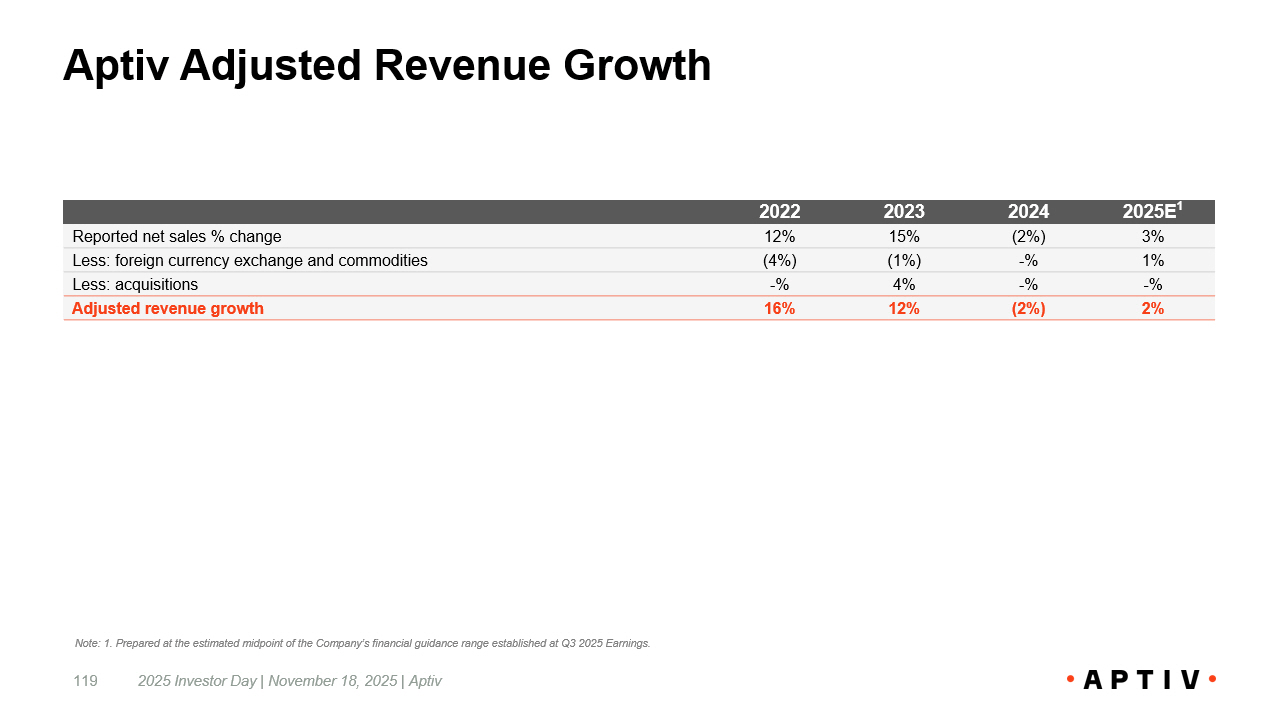 Aptiv调整后收入增长2025年投资者日| 2025年11月18日| Aptiv 119 2025E 12024202320223%(2%)15% 12%报告净销售%变动% 1%-%(1%)(4%)减:外币兑换和商品-%-% 4%-%减:收购2%(2%)12% 16%调整后收入增长注:1。按2025年第三季度收益时确定的公司财务指导范围的估计中点编制。