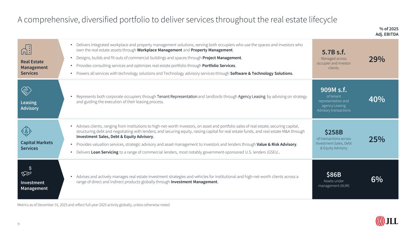 我们的广度和全球交付模式适合于多服务、更长时间的关系,从而推动份额增长和经常性收入。我们的定位是获取多种收入来源,因为投资组合重新定位需要跨地域和物业类型的综合战略和执行。我们在整个投资生命周期中数据丰富的情报为全球机构和私人投资者提供战略建议和价值。随着客户投资于高性能建筑,我们提供综合能源解决方案以及端到端的脱碳和改造计划。我们正在大规模将数据和人工智能嵌入房地产工作流程,从而提高我们核心服务的绩效并推动顶线和底线增长。外包的长期强劲顺风显著领先占用者和投资者正在重塑跨城市、行业和物业类型的投资组合机构和高净值投资者增加AUM并寻求规模、透明度和数据能源绩效、可持续资产和咨询服务的需求不断增长数据和人工智能转型能力以及重新定义客户期望JLL在我们的各个业务中都处于有利地位,可以从长期行业动态中受益24