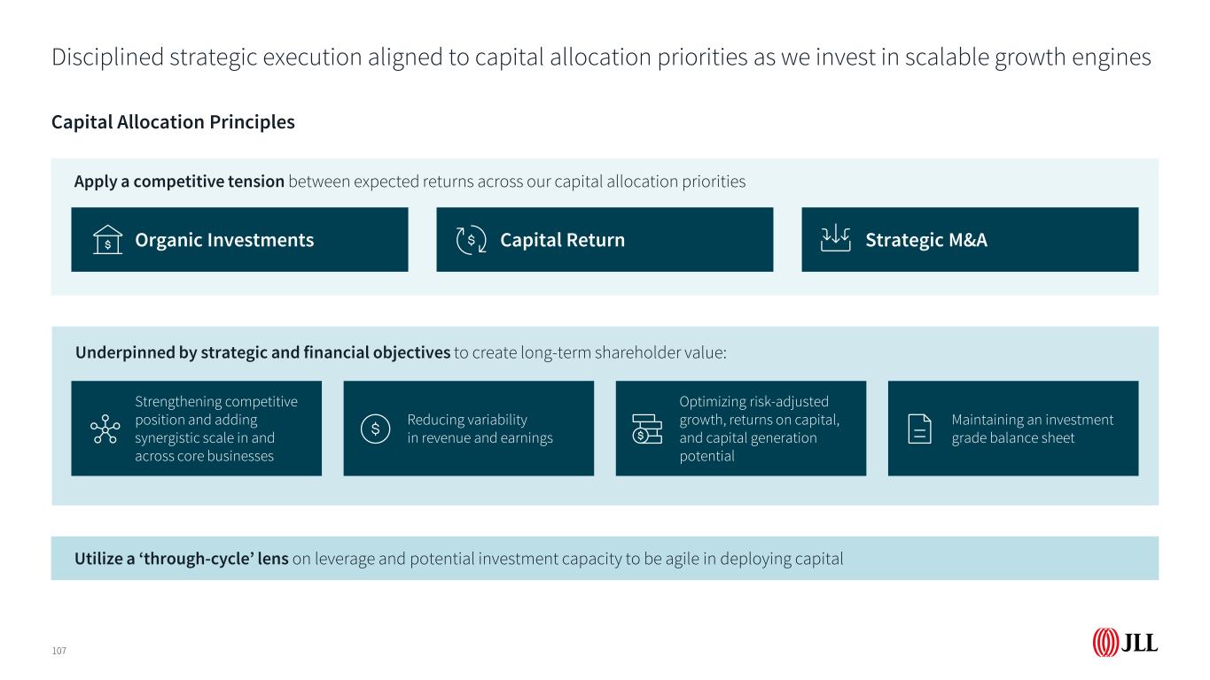 聪明、有纪律的并购加速增长并提供协同规模效益108 SKAE(2024年第二季度)提高(2024年第四季度)代表性交易战略并购标准•建立协同规模•能力扩展竞争护城河•增强业务弹性•互补文化战略契合度•投资资本回报率超过资本成本Strong Economics以数据中心为重点的项目管理和工作场所管理公司具有非凡的战略和文化契合度,增强了我们的能力和弹性,并在快速增长的行业垂直领域增加了即时规模;提供有吸引力的经济性并迅速融入现有业务。具有独特的技术赋能的工作流管理能力并扩大竞争优势的租赁券商;快速融入现有业务,获得快速的JLL用户采用并提高客户满意度,从而提高生产力和胜率。Executable •从JLL的平台产生杠杆作用• Playbook执行及时整合•互补的文化
