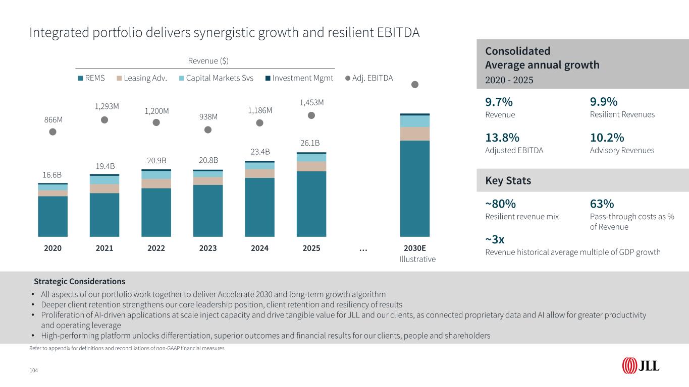 投资管理展望脱离资本周期底部103 1AUM截至2025年12月31日,报告滞后一个季度2截至12月31日的资本承诺,2025年2.3%咨询费-1.1 %调整后EBITDA 2020-2025年投资管理年均增长关键数据$ 86B管理下资产(AUM)1自202124225004764844684509210896104100842020202120222022202320242025…2030E REMS Leasing Adv. Capital Markets Svs Investment MGMT Adj. EBITDA战略考虑•修订后的战略:专注于为我们的客户推动领先的投资业绩,并提高增长和分部回报的盈利能力•来自利润率增值、可扩展机会的增长,与机构和高净值投资者的长期投资目标保持一致• JLL平台作为市场差异化因素,利用人工智能和JLL的独特优势来增强投资决策、推动增长并提高运营效率•筹资势头预计将支持咨询费的稳步增长,战略重点是信贷和核心说明性非公认会计准则财务指标的定义和调节请参阅附录收入(美元)
