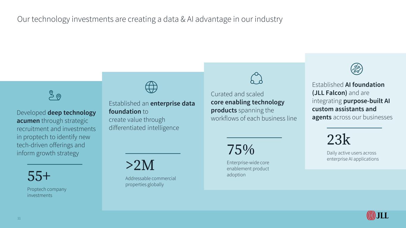 我们的技术投资正在我们的行业中创造数据和人工智能优势建立了企业数据基础,通过差异化智能创造价值通过战略招聘和对proptech的投资发展了深厚的技术敏锐度,以识别新的技术驱动产品并为增长战略提供信息策划和扩展的核心支持技术产品,跨越每个业务线的工作流程建立了AI基础(JLL Falcon),并正在我们的业务中整合专门构建的AI定制助手和代理全球范围内11 > 200万可寻址商业物业75%的企业范围核心支持产品采用2.3万跨企业AI应用的日活跃用户55 + Proptech公司投资