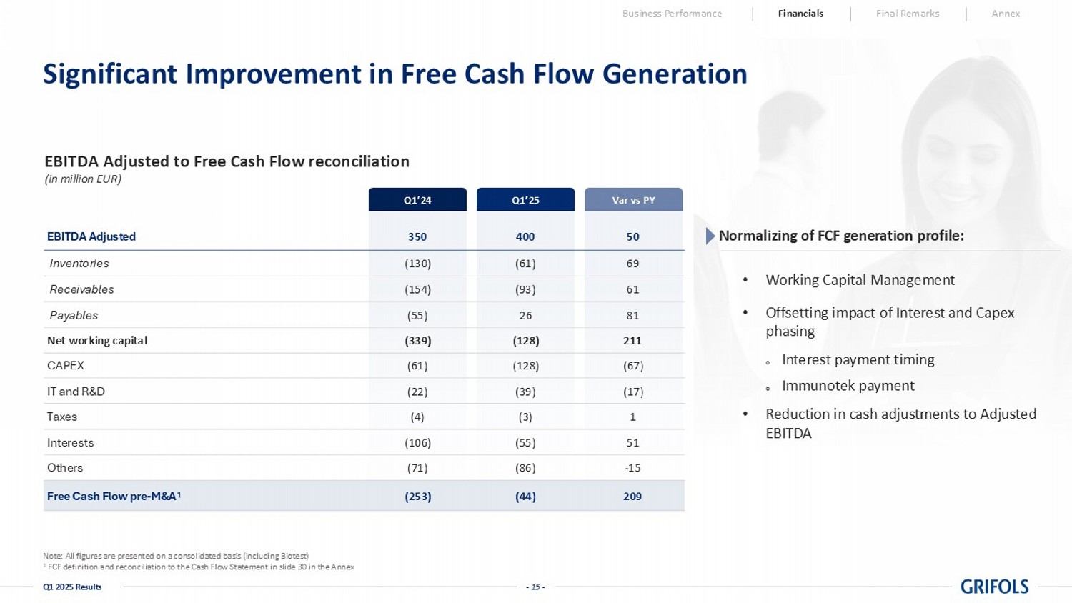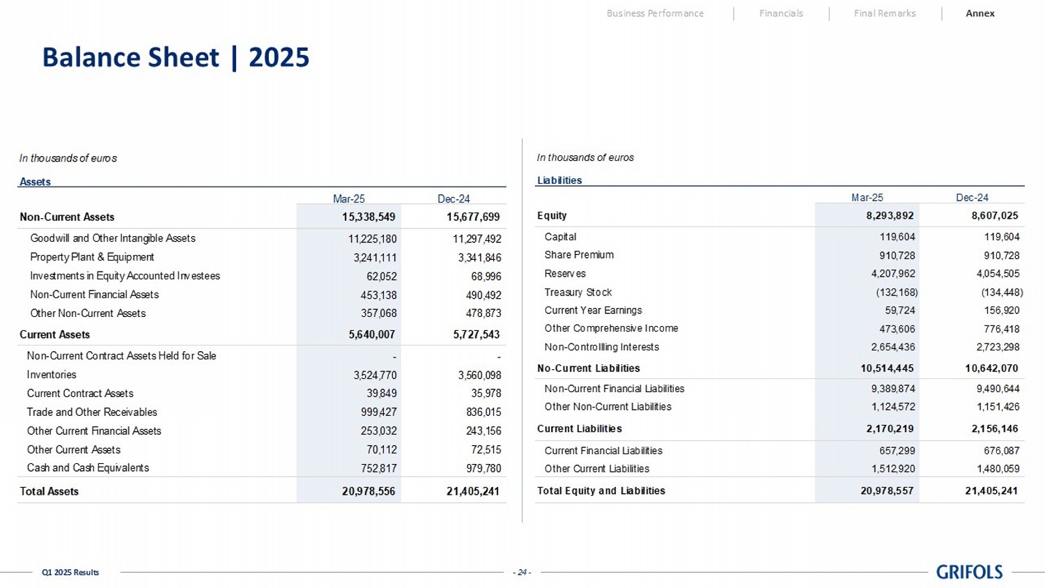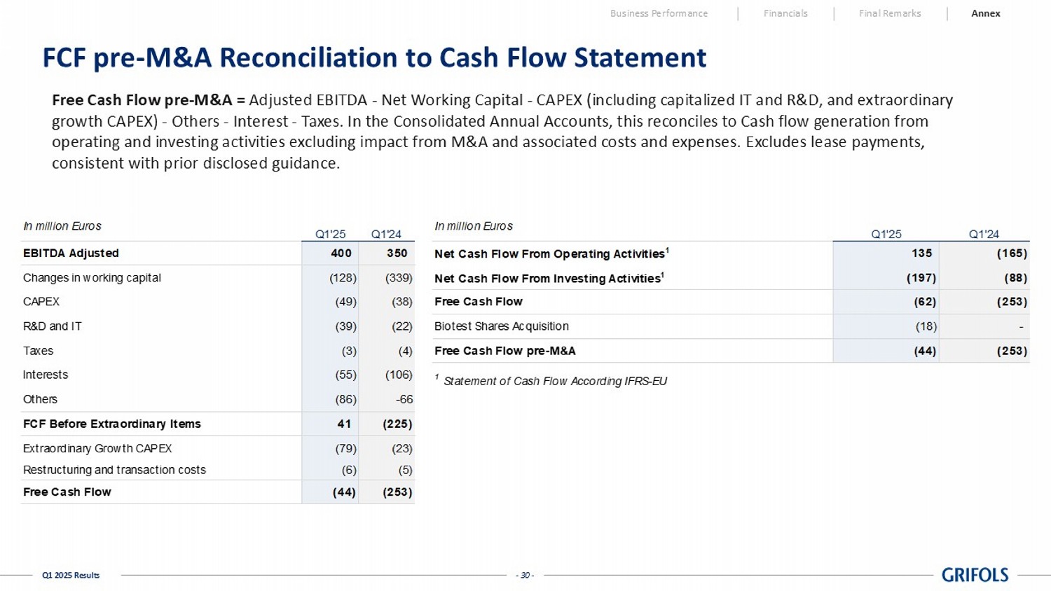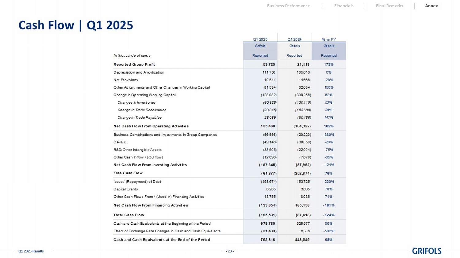-23-2025年第一季度业绩现金流| 2025年第一季度经营业绩财务最终评论附件单位:千欧元报告报告报告报告报告集团利润59,72521,418179%折旧和摊销111,750105,6166%净拨备10,54114,666-28 %其他调整和其他营运资本变动81,53432,634150%经营营运资本变动(128,082)(339,256)62%存货变动(60,826)(130,110)53%贸易应收账款变动(93,345)(153,680)39%贸易应付账款变动26,089(55,466)147%经营活动产生的现金流量净额135,468(164,922)182%业务合并及对集团公司的投资(96,998)(20,220)-380 % CAPEX(49,146)(38,050)-29 %研发/其他无形资产(38,505)(22,004)-75 %其他现金流入/(流出)(12,696)(7,678)-65 %投资活动产生的现金流量净额(197,345)(87,952)-124 %自由现金流(61,877)(252,874)76%发行/(偿还)债务(153,674)153,725-200 %资本赠与6,2653,69570%来自/(用于)融资活动的其他现金流量13,7558,03671%融资活动产生的现金流量净额(133,654)165,456-181 %总现金流(195,531)(885,及期初现金等价物979,780529,57785%汇率变动影响现金及现金等价物(31,433)6,386-592%期末现金及现金等价物752,816448,54568% Q1 2025 Q1 2024% vs PY Grifols Grifols