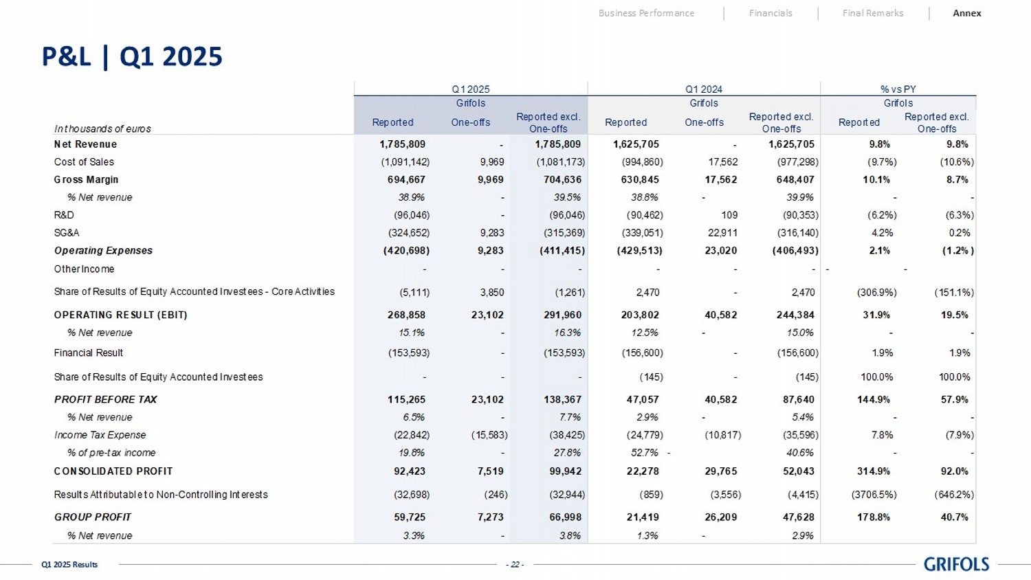 -22-2025年第一季度业绩损益| 2025年第一季度经营业绩财务最终评论附件单位:千欧元已报告一次性报告不含税。One-off Reported One-off Reported excl。One-off Reported Reported excl。一次性净收入1,785,809-1,785,8091,625,705-1,625,7059.8% 9.8%销售成本(1,091,142)9,969(1,081,173)(994,860)17,562(977,298)(9.7%)(10.6%)毛利率694,6679,969704,636630,84517,562648,40710.1% 8.7% %净营收38.9%-39.5% 38.8%-39.9%--研发(96,046)-(96,046)(90,462)109(90,353)(6.2%)(6.3%)SG & A(324,652)9,283(315,369)(339,051)22,911(316,140)4.2% 0.2%营业费用19.5%%净营收15.1%-16.3% 12.5%-15.0%--财务业绩(153,593)-(153,593)(156,600)-(156,600)1.9% 1.9%---(145)-(145)100.0% 100.0%税前利润115,26523,102138,36747,05740,58287,640144.9% 57.9% %%净营收6.5%-7.7% 2.9%-5.4%--所得税费用(22,842)(15,583)(38,425)(24,779)(10,817)(35,596)税前收入的7.8%(7.9%)% 19.8%-27.8% 52.7%-40.6%--综合利润92,4237,5 1999,942利润59,7257,27366,99821,41926,20947,628178.8% 40.7%%净营收3.3%-3.8% 1.3%-2.9% Q1 2025% vs PY占权益被投资方的业绩份额占权益被投资方的业绩份额-核心活动Grifols GrifolsGrifols Q1 2024