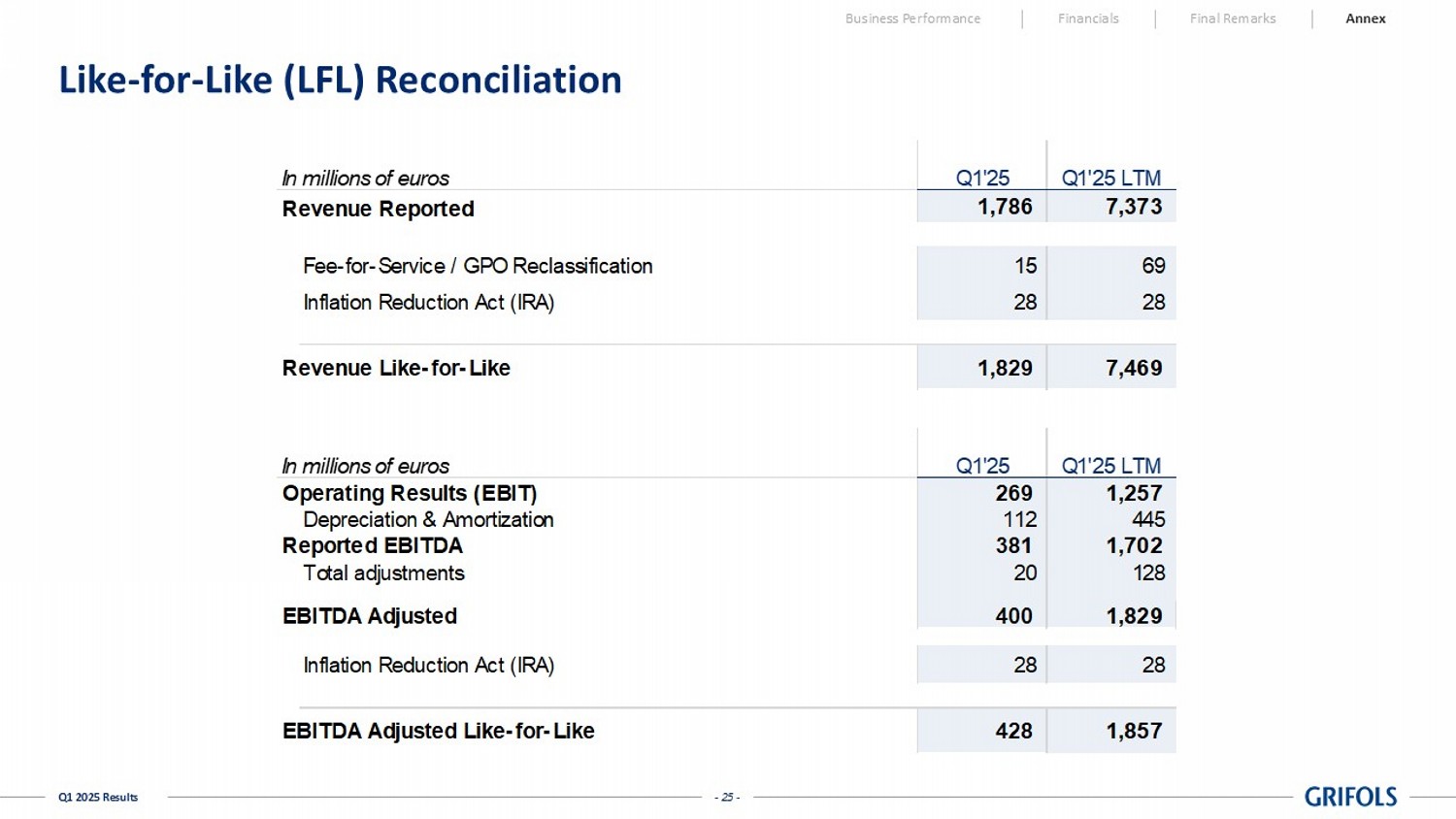 -25-2025年第一季度业绩同类(LFL)调节业务业绩财务最终评论附件百万欧元Q1‘25 Q1’25 LTM收入报告1,7867,373按服务收费/GPO重新分类1569通货膨胀削减法案(IRA)2828收入同类1,8297,469百万欧元Q1 ' 25 LTM经营业绩(EBIT)2691,257折旧和摊销112445报告EBITDA 3811,702总调整数20128 EBITDA调整后4001,829通货膨胀削减法案(IRA)2828 EBITDA调整后同类4281,857