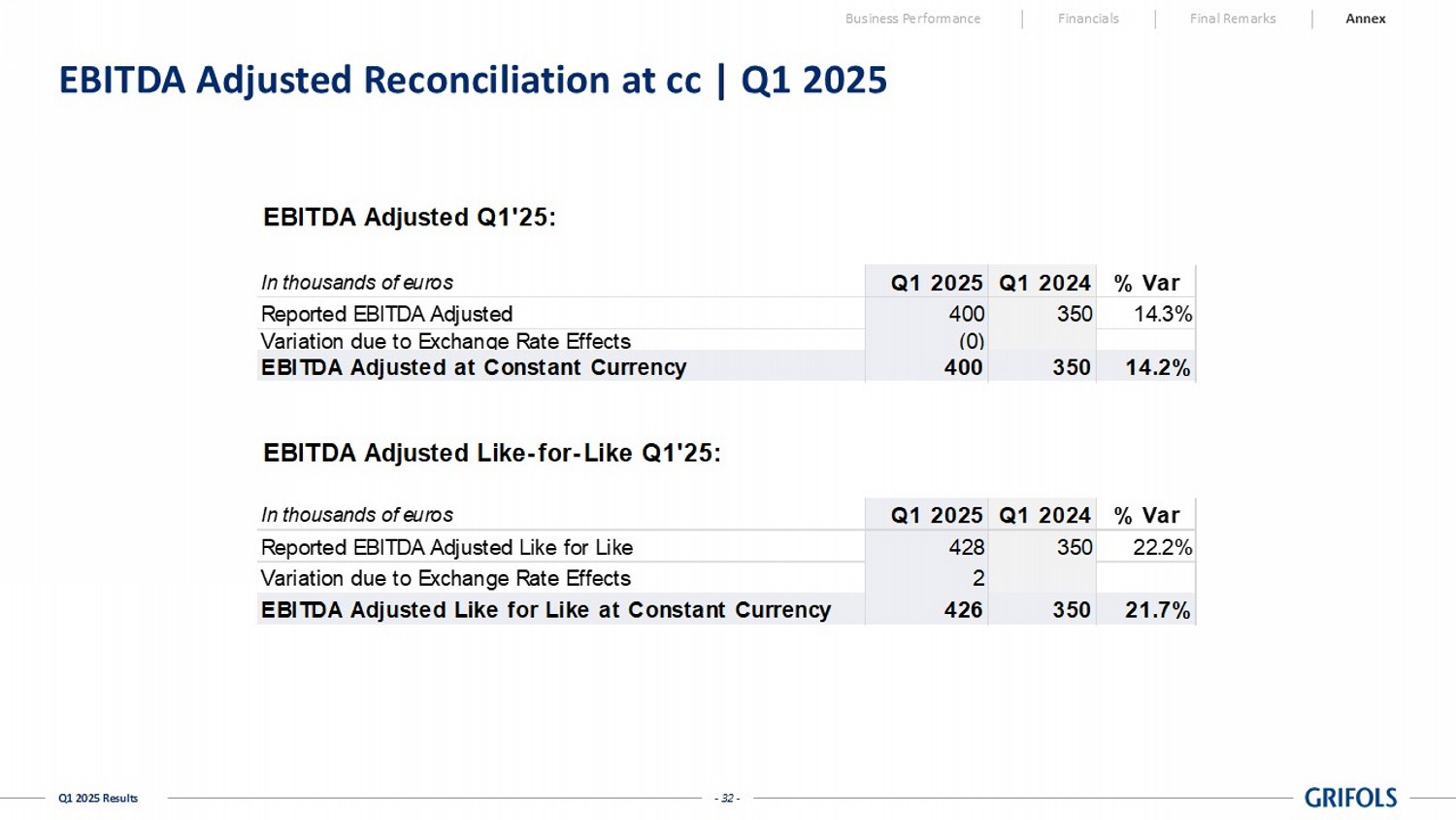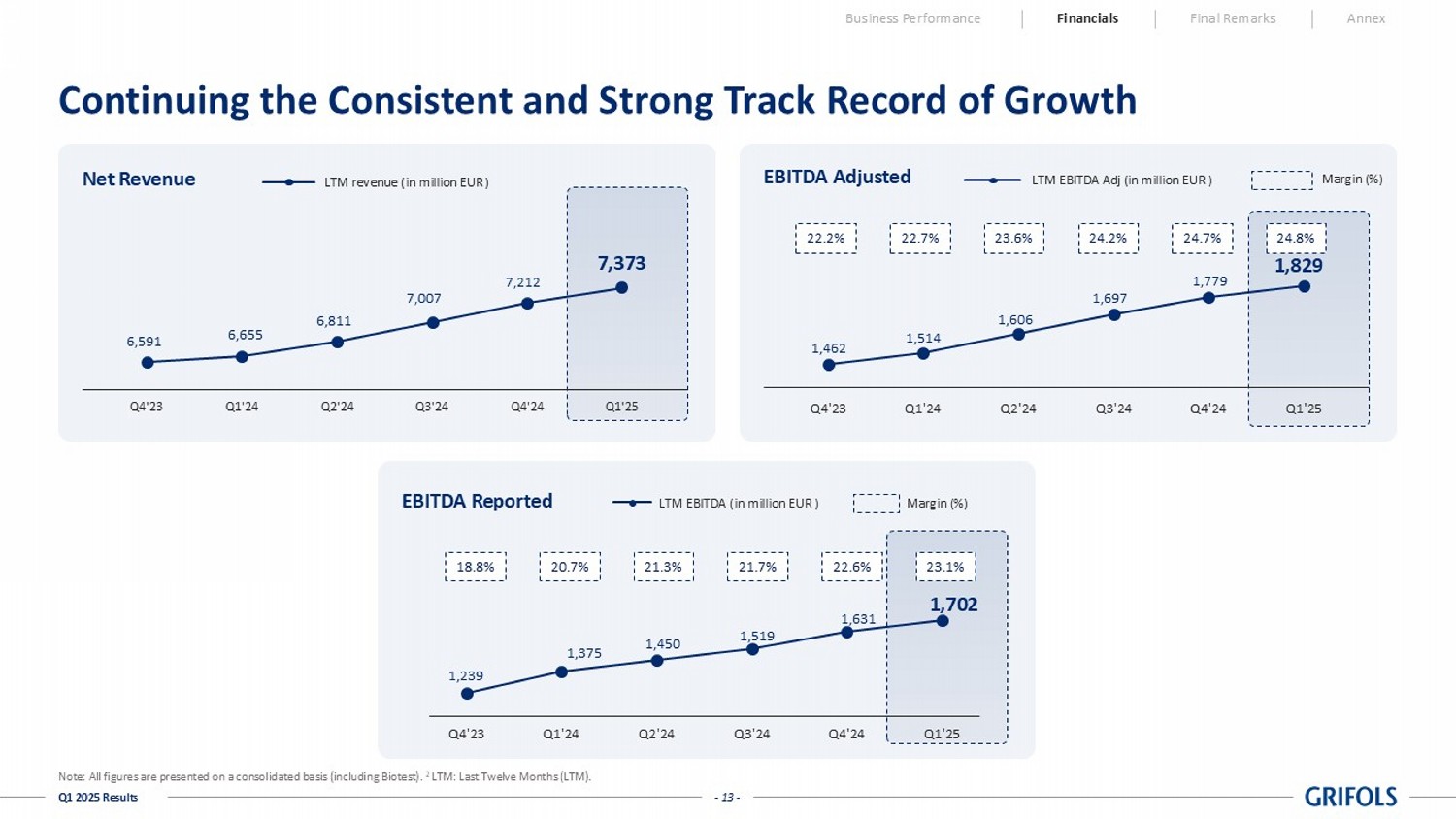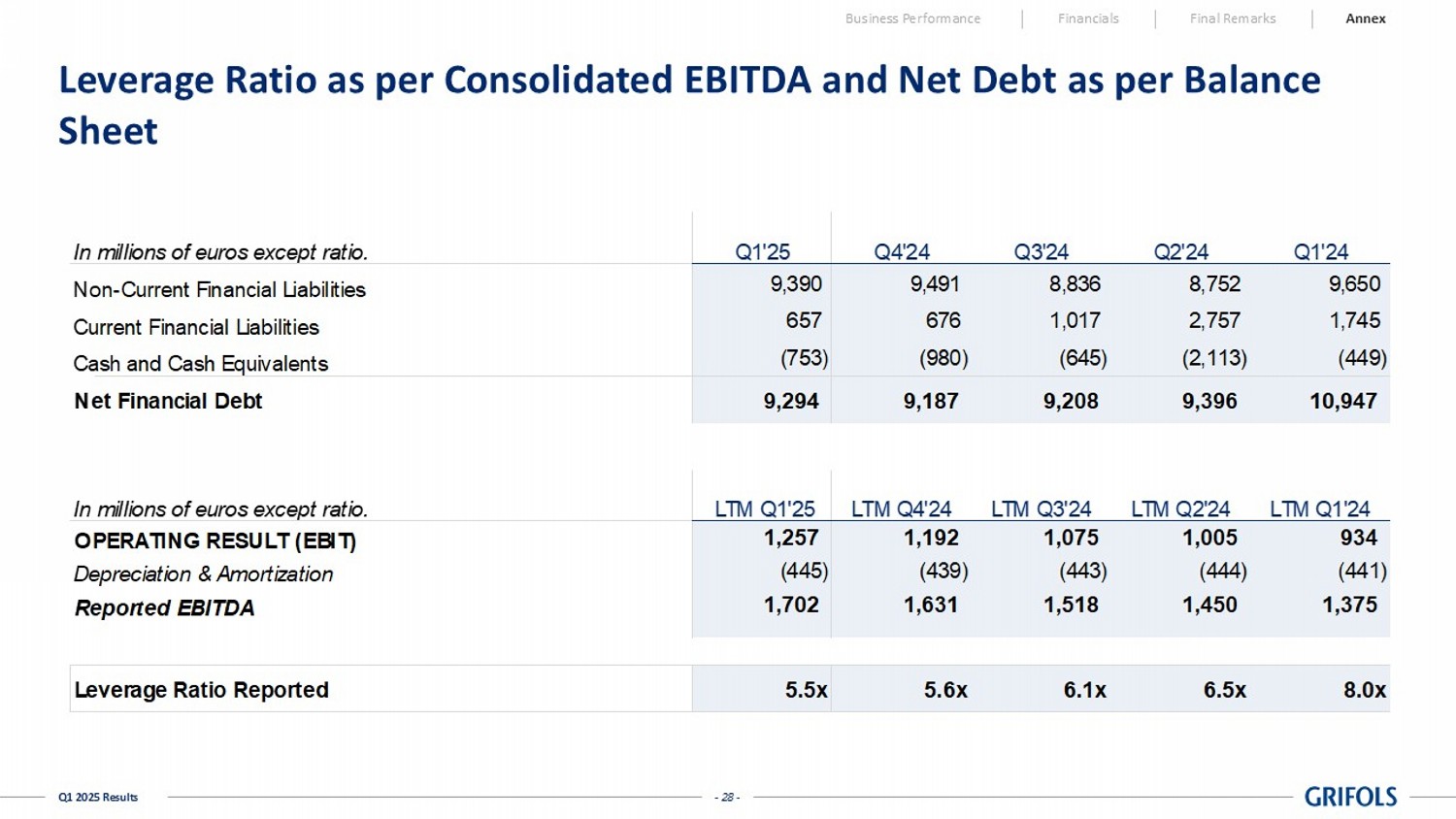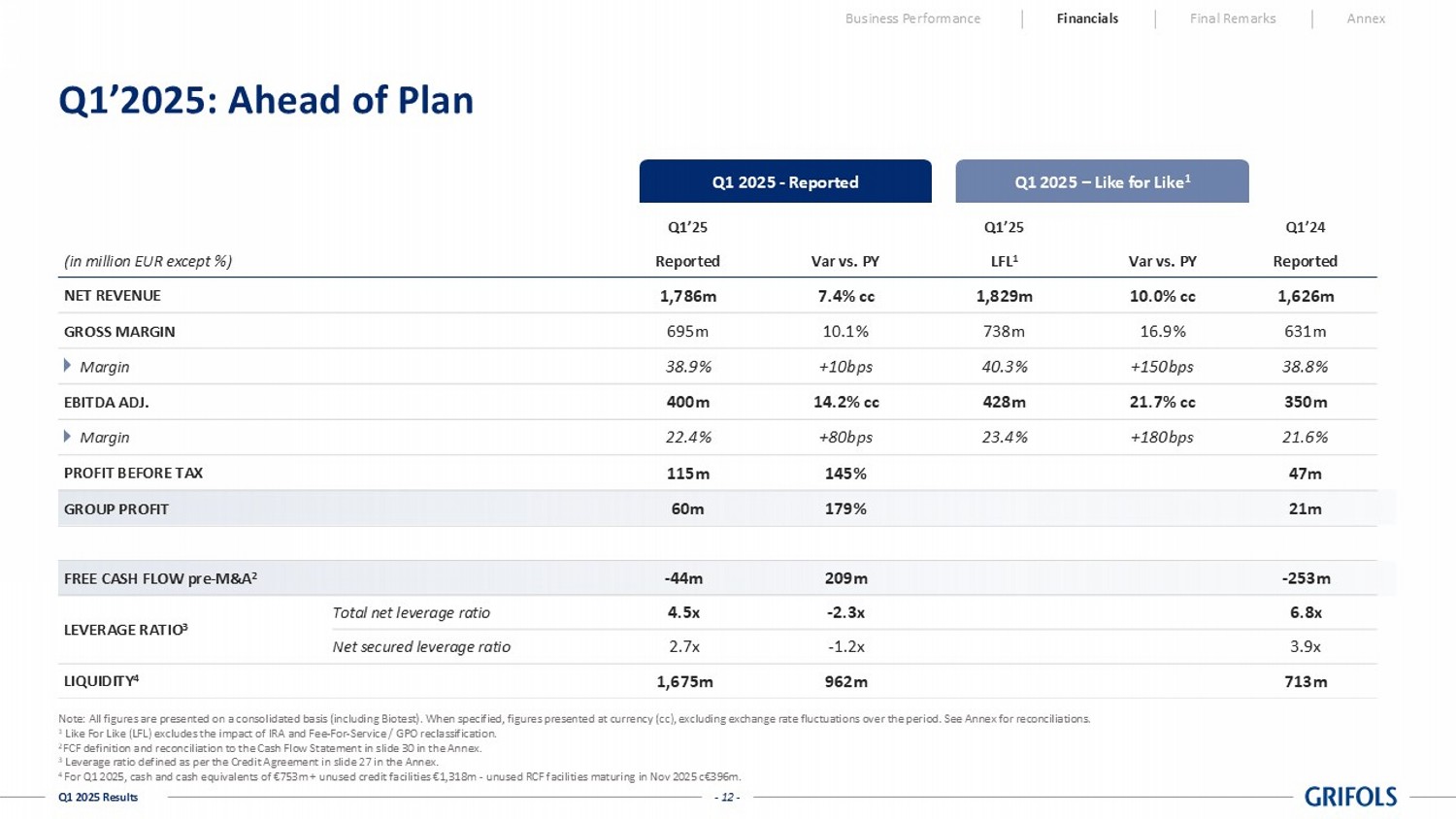 西班牙巴塞罗那– 2025年5月12日– Grifols(MCE:GRF,MCE:GRF.P,NASDAQ:GRFS),一家全球医疗保健公司和血浆衍生药物的领先制造商,今天证实,其报告的2025年第一季度财务业绩提前于计划,为过去十二个月(LTM)关键财务指标的创纪录业绩做出了贡献。Grifols仍然专注于继续执行其战略计划,并重申其对2025财年的指导。