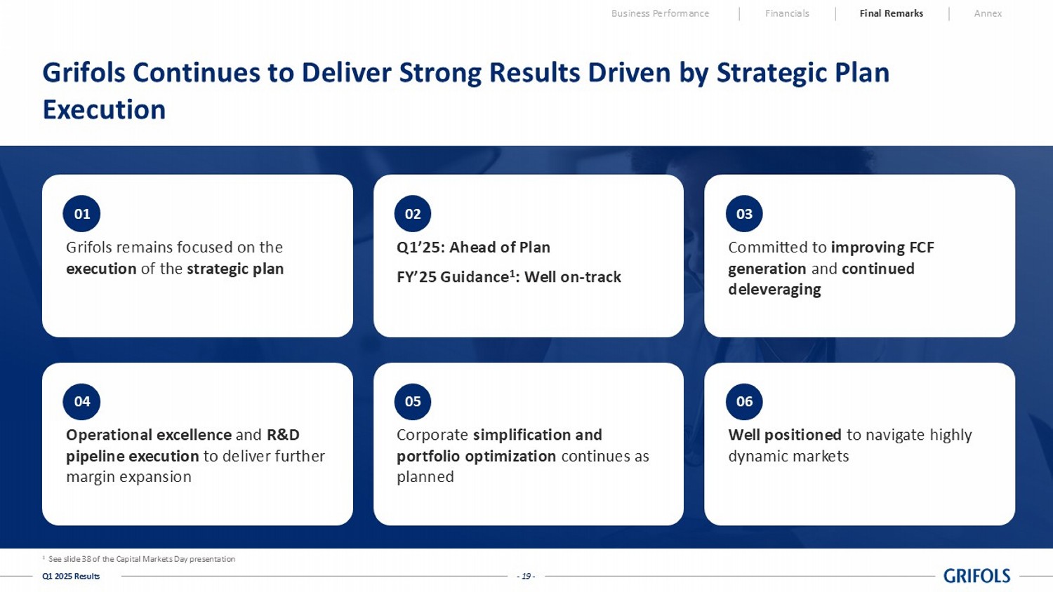 -19日-2025年第一季度业绩Grifols仍然专注于战略计划的执行Q1‘25:超前于计划FY’25指导1:顺利步入正轨致力于改善FCF生成并持续去杠杆化的卓越运营和研发管道执行,以实现利润率的进一步扩张公司简化和投资组合优化继续按计划进行,处于有利地位,以驾驭高度活跃的市场010203040506 Grifols在战略计划执行的推动下继续提供强劲的结果业务绩效财务最后评论附件1见资本市场日演示文稿的幻灯片38