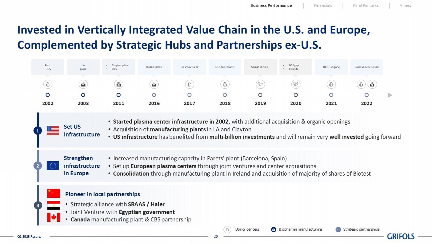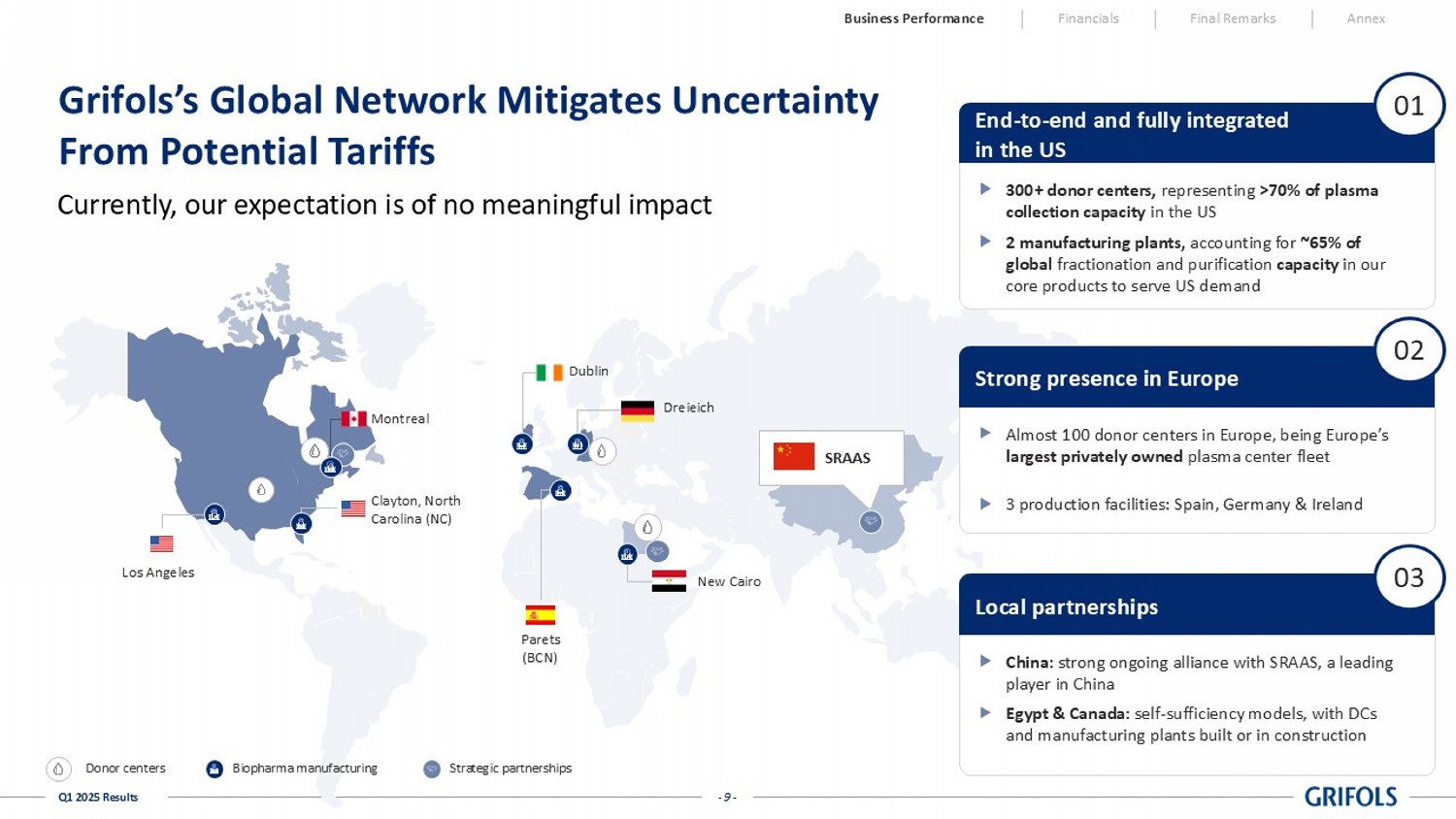 -9-2025年第一季度业绩Grifols的全球网络减轻了潜在关税带来的不确定性北卡罗来纳州洛杉矶克莱顿(NC)蒙特利尔新开罗Parets(BCN)都柏林SRAAS Dreieich Donor Center Biopharma制造战略合作伙伴关系端到端并完全整合到美国300 +个捐赠中心,占美国2家制造工厂血浆采集能力的70%以上,占我们核心产品中全球分馏和纯化能力的约65%,以服务美国需求01在欧洲的强大存在欧洲近100个捐赠中心,作为欧洲最大的私营等离子中心车队3生产设施:西班牙、德国和爱尔兰02当地伙伴关系中国:与中国领先企业SRAAS的强大持续联盟埃及和加拿大:自给自足模式,已建成或在建DC和制造工厂03目前,我们的预期没有有意义的影响业务业绩财务最后评论附件