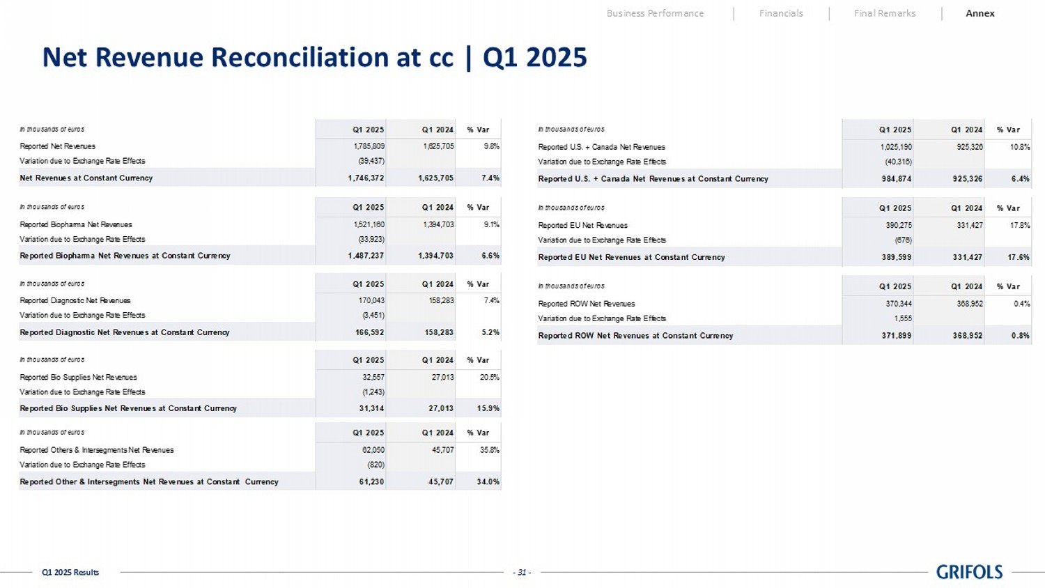 -31-2025年第一季度业绩净收入按CC对账| 2025年第一季度以千欧元计2025年第一季度2024年第一季度VAR报告的美国+加拿大净收入1,025,190925,326因汇率影响而变动10.8%(40,316)报告的美国+加拿大按固定货币计算的净收入984,874925,3266.4%以千欧元计2025年第一季度2024年第一季度VAR报告的欧盟净收入390,275331,42717.8%因汇率影响而变动(676)报告的按固定货币计算的欧盟净收入389,599331,42717.6%以千欧元计2025年第一季度2024年第一季度VAR报告的ROW净收入370,344368,9520.4%因汇率影响而变动1,555按固定汇率计算的ROW报告净收入371,899368,9520.8%以千欧元计2025年第一季度2024年第一季度VAR报告的净收入1,785,8091,625,7059.8%因汇率影响而变动(39,437)按固定汇率计算的净收入1,746,3721,625,7057.4%以千欧元计2025年第一季度2024年第一季度VAR报告的生物制药净收入1,521,1601,394,7039.1%因汇率影响而变动(33,923)按固定汇率计算的报告的生物制药净收入1,487,2371,394,7036.6%以千欧元计2025年第一季度2024年第一季度VAR报告的诊断净收入170,043158,2837.4%因汇率影响而变动(3,451)报告的以固定货币计算的诊断净收入166,592158,2835.2%以千欧元计2025年第一季度2024年第一季度VAR报告的生物用品净收入32,55727,01320.5%因汇率影响而变动(1,243)报告的以固定货币计算的生物用品净收入31,31427,01315.9%以千欧元计2025年第一季度2024年第一季度VAR报告的其他和部门间净收入62,05045,70735.8%因汇率影响而变动(820)报告的其他和部门间以固定货币计算的净收入61,23045,70734.0%业务业绩财务最后备注附件