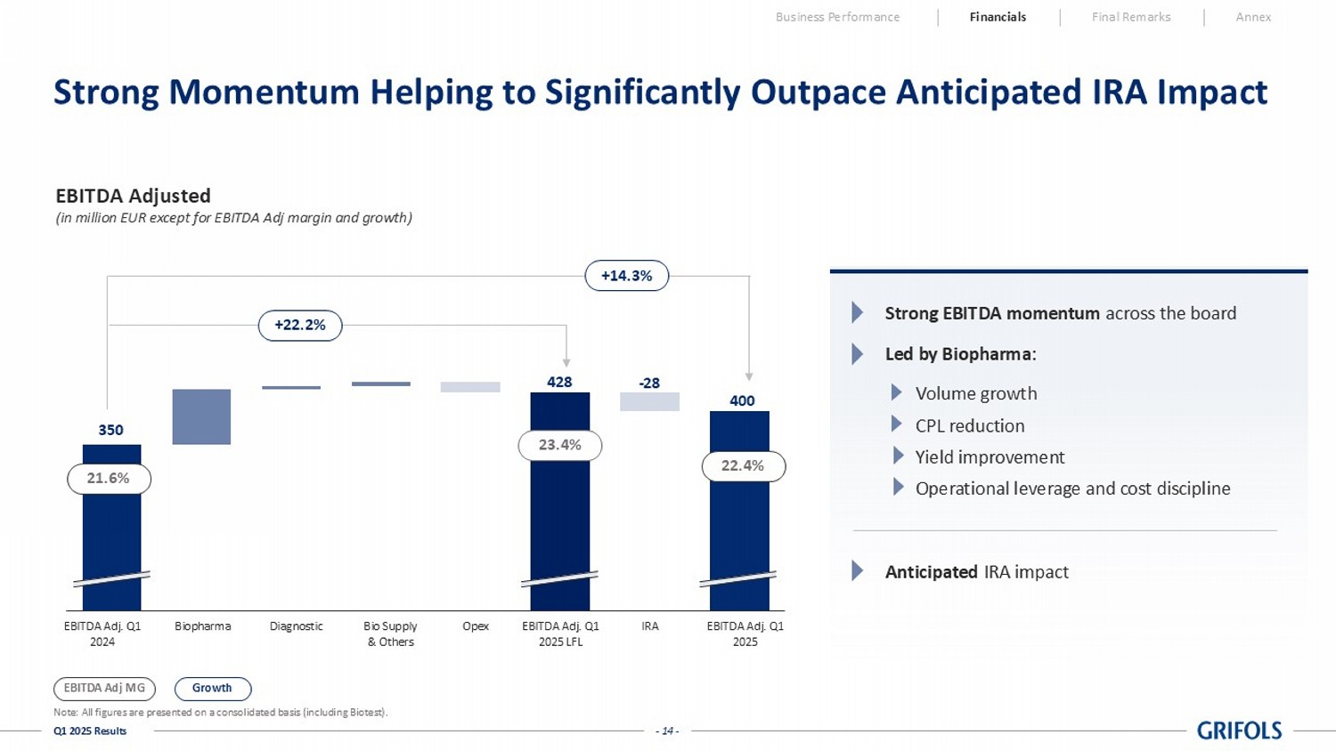 -14-2025年第一季度业绩强劲势头有助于显着超过预期的IRA影响业务业绩财务最终评论附件EBITDA调整后(百万欧元,EBITDA调整后利润率和增长除外)全面强劲的EBITDA势头L ed by Biopharma:数量增长CPL减少产量改善运营杠杆和成本纪律预期IRA影响注:所有数字均以综合基础呈现(包括Biotest)。12345678350428400-28 + 22.2% + 14.3% EBITDA Adj. Q1 2024 Biopharma EBITDA Adj. Q1 2025 Diagnostic Bio Supply & Others OPEX EBITDA Adj. Q1 2025 LFL IRA21.6 % 23.4% 22.4% EBITDA Adj MG Growth