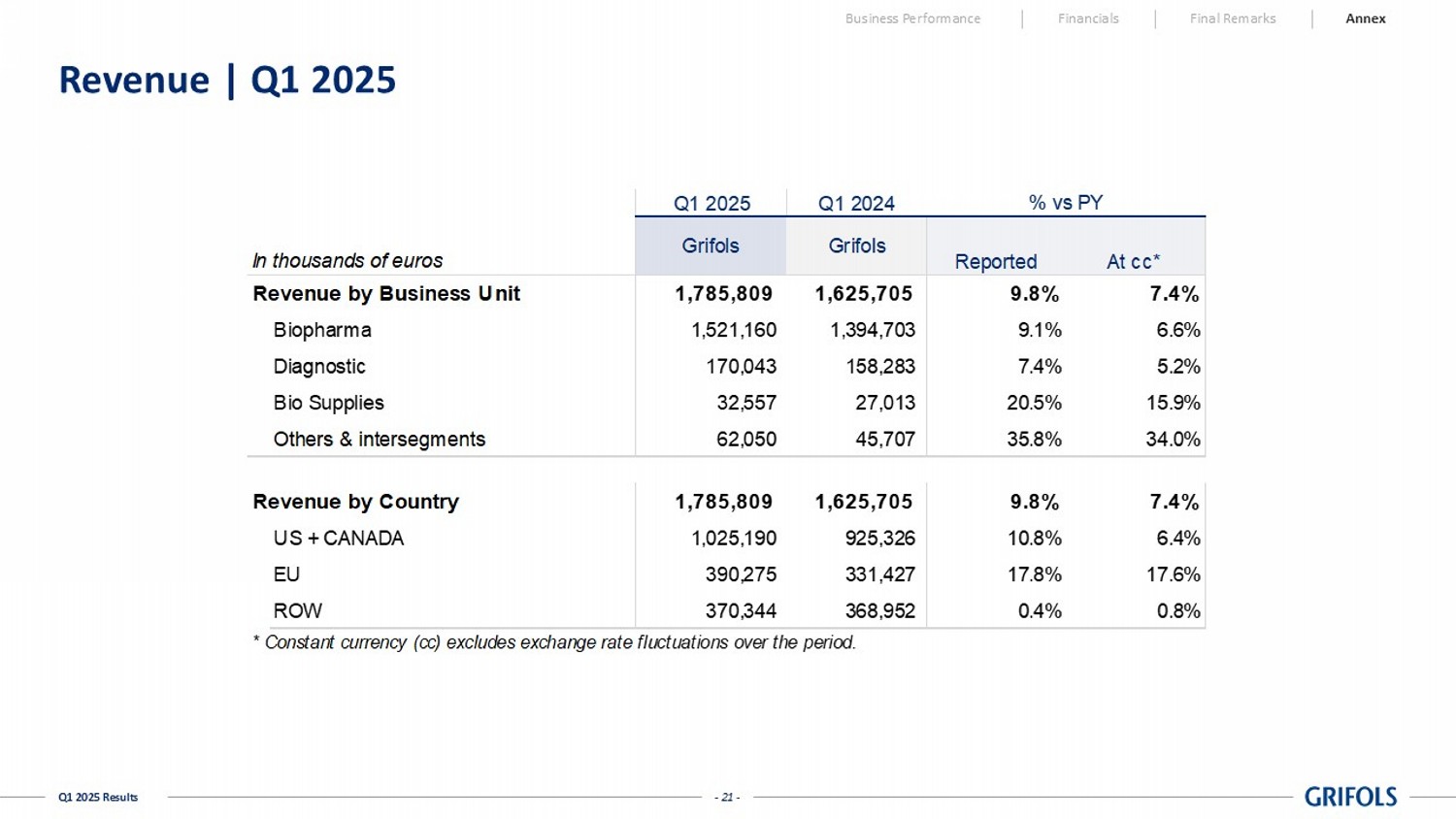 -21-2025年第一季度业绩收入| 2025年第一季度2025年第一季度2024年第一季度以千欧元计报告于CC*按业务单位划分的收入1,785,8091,625,7059.8% 7.4%生物制药1,521,1601,394,7039.1% 6.6%诊断170,043158,2837.4% 5.2%生物用品32,55727,01320.5% 15.9%其他&部门间62,05045,70735.8% 34.0%按国家划分的收入1,785,8091,625,7059.8% 7.4%美国+加拿大1,025,190925,326 10.8% 6.4%欧盟390,275331,42717.8% 17.6% ROW 370,344368,9520.4% 0.8%*不变货币(CC)不包括该期间的汇率波动。Grifols Grifols % vs. PY经营业绩财务决算附件