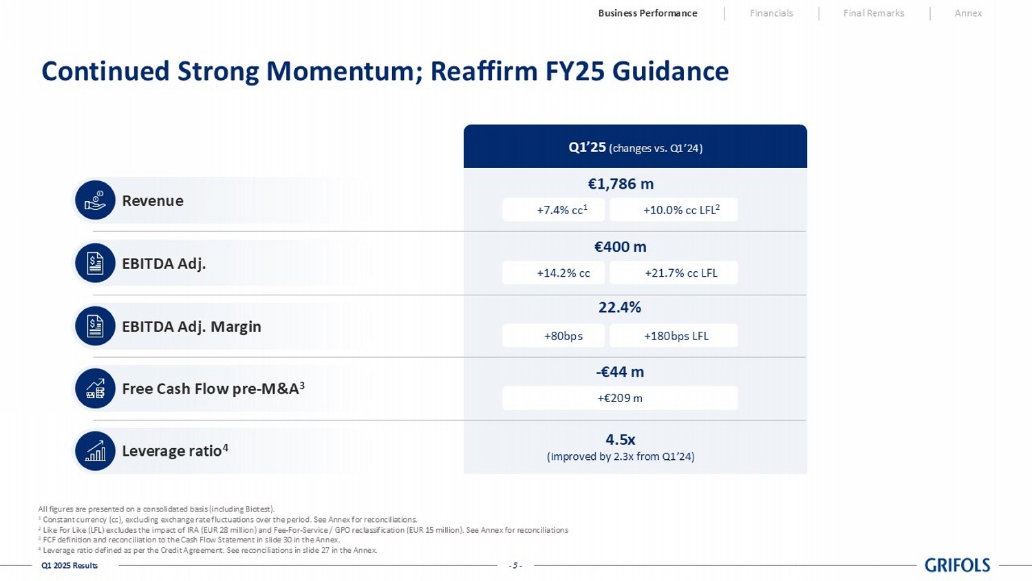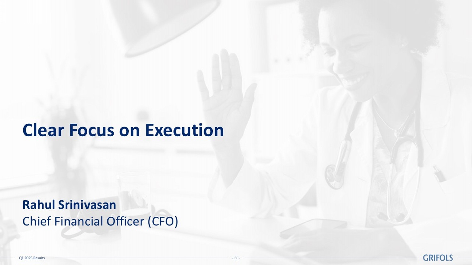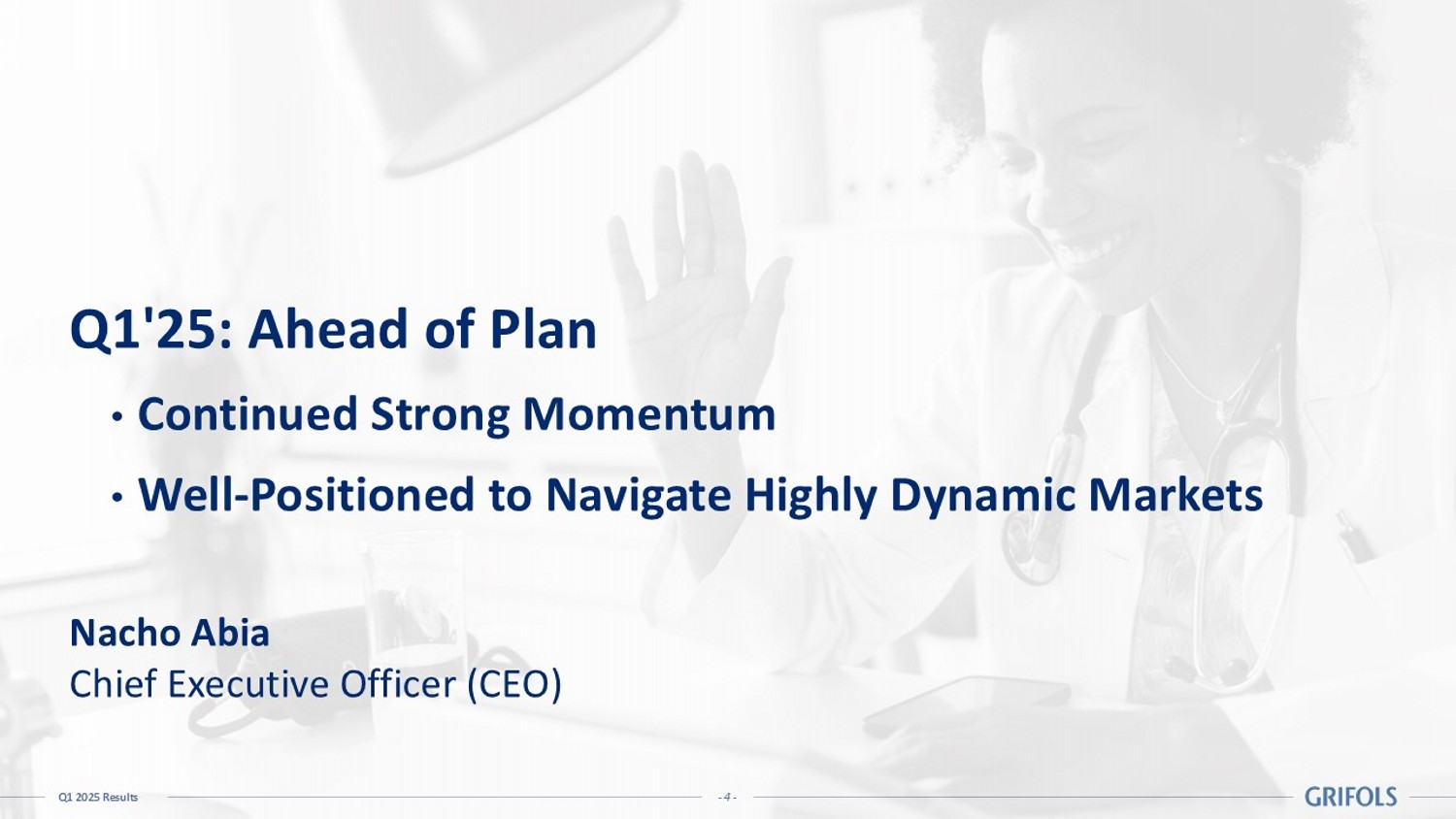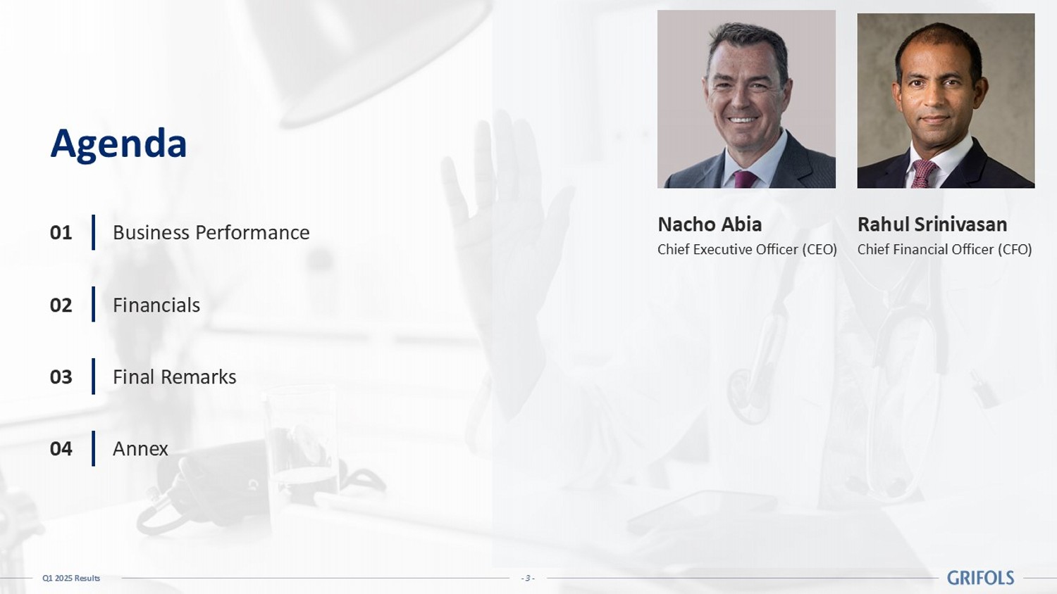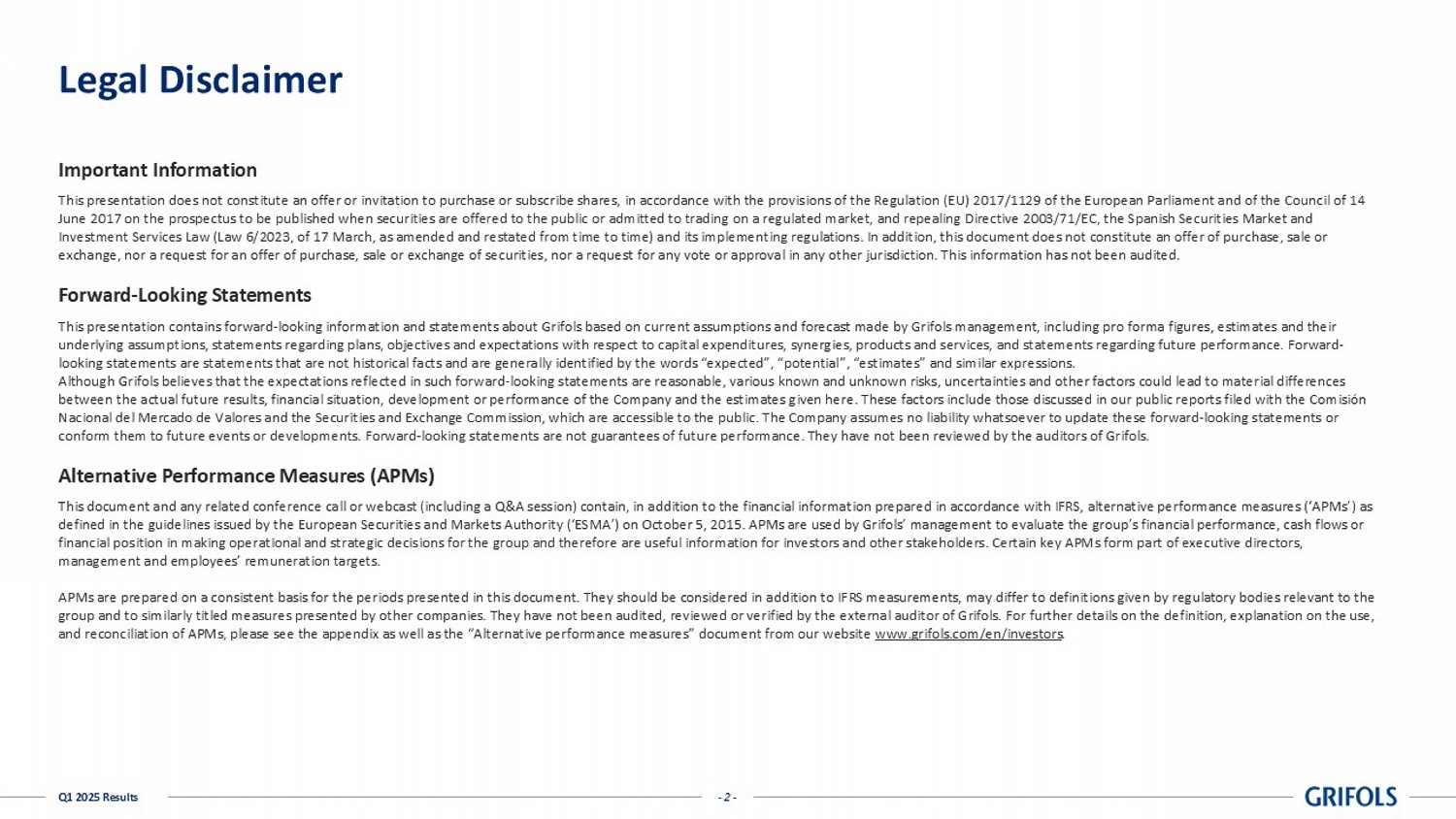 -2-2025年第一季度业绩法律免责声明重要信息本演示文稿不构成购买或认购股份的要约或邀请,根据2017年6月14日欧洲议会和理事会条例(EU)2017/1129关于当证券向公众发售或获准在受监管的m ark et上交易时将公布的招股说明书的条款,以及废除指令2003/71/EC、西班牙证券市场和投资服务法(3月17日第6/2023号法律,不时修订和重述)及其实施条例。此外,本文件不构成购买、出售或交换的要约,也不构成购买、出售或交换证券的要约请求,也不构成在任何其他司法管辖区进行任何投票或批准的请求。这些信息未经审计。前瞻性陈述本演示文稿包含基于当前假设和Grifols管理层预测ma de的关于Grifols的前瞻性信息和陈述,包括备考数字、估计及其基本假设,关于资本支出、协同效应、产品和服务的计划、目标和预期的陈述,以及关于未来业绩的陈述。前瞻性陈述是一种非历史事实的陈述,通常由“预期”、“有效的ial”、“估计”和类似的表达方式来识别。尽管Grifols认为此类前瞻性陈述中反映的预期是合理的,但各种已知和未知的风险、不确定性和其他因素可能导致公司的实际未来结果、财务状况、发展或业绩与她给出的估计之间存在重大差异。这些因素包括我们在提交给Commisi ó n Nacional del Mercado de Valores和证券交易委员会的公开报告中讨论的因素,这些因素可供公众查阅。公司对更新这些前瞻性陈述或使其符合未来事件或发展没有任何责任。前瞻性陈述并非对未来业绩的保证。他们没有经过Grifols审计机构的审查。替代绩效衡量标准(APMs)本文件及任何相关电话会议或网络广播(包括问答环节)除根据国际财务报告准则编制的财务信息外,还包含欧洲证券和市场管理局(‘ESMA’)于2015年10月5日发布的指南中定义的替代绩效衡量标准(‘APMs’)。APM被Grifols的管理层用来评估集团的财务业绩、现金流或财务状况,为集团做出运营和战略决策,因此对于投资者和其他利益相关者来说是有用的信息。某些关键的APM构成执行董事、管理层和员工薪酬目标的一部分。APM是在本文件所述期间的一致基础上编制的。它们应该在IFR S测量之外被考虑,可能与与该集团相关的监管机构给出的定义以及其他公司提出的类似标题的测量不同。它们没有经过Grifols的前任性审计机构的审计、审查或验证。有关APM的定义、使用解释和调节的更多详细信息,请参阅附录以及我们websi te www.grifols.com/en/investors的“替代绩效衡量”文件。
