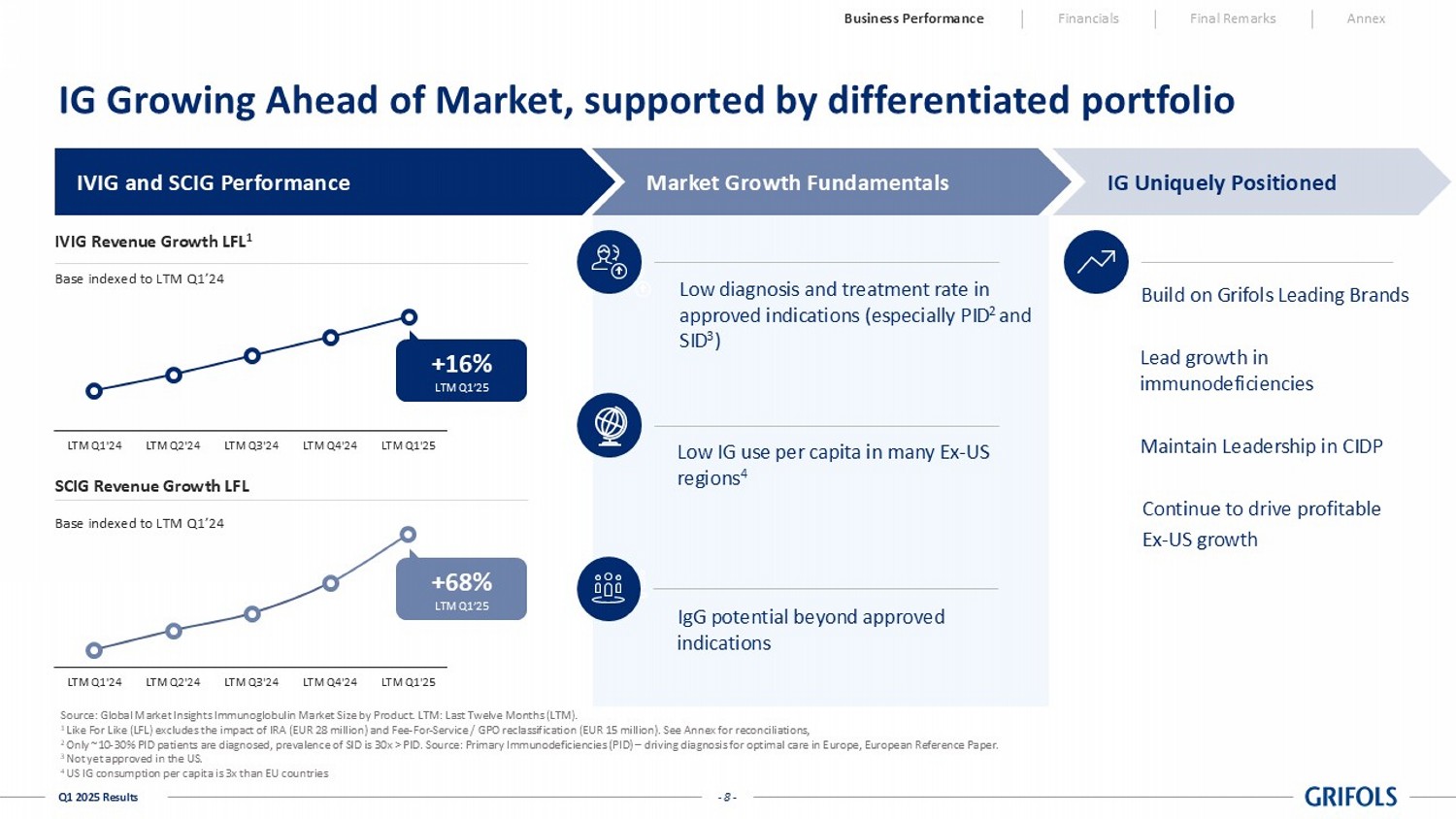 -7-2025年第一季度业绩Biopharma在IG特许经营增长17.5% LFL 1的引领下实现强劲业绩' 25年第一季度业务业绩财务最后评论附件Biopharma免疫球蛋白白蛋白Alpha-1和Specialty P roteins • IVIG + 13.5% CC LFL 1 • SCIG + 98.9% CC LFL 1 •由于计划在中国续签进口药品许可证而分阶段进行• Alpha-1的增加•部分被狂犬病的分阶段进行所抵消+ 17.5%-8.9% + 2.3% + 9.6% + 13.2%-9.4% + 1.0% + 6.6% LFL报告的增长按固定货币(CC)计注:所有数字均以综合基准(包括Biotest)和按固定货币(CC)列报,不包括该期间的交易所E R ate波动。调节见附件。1 Like for Like(LFL)不包括IRA(2800万欧元)和Fee-for-Service/GPO重新分类(1500万欧元)的影响。调节见附件。
