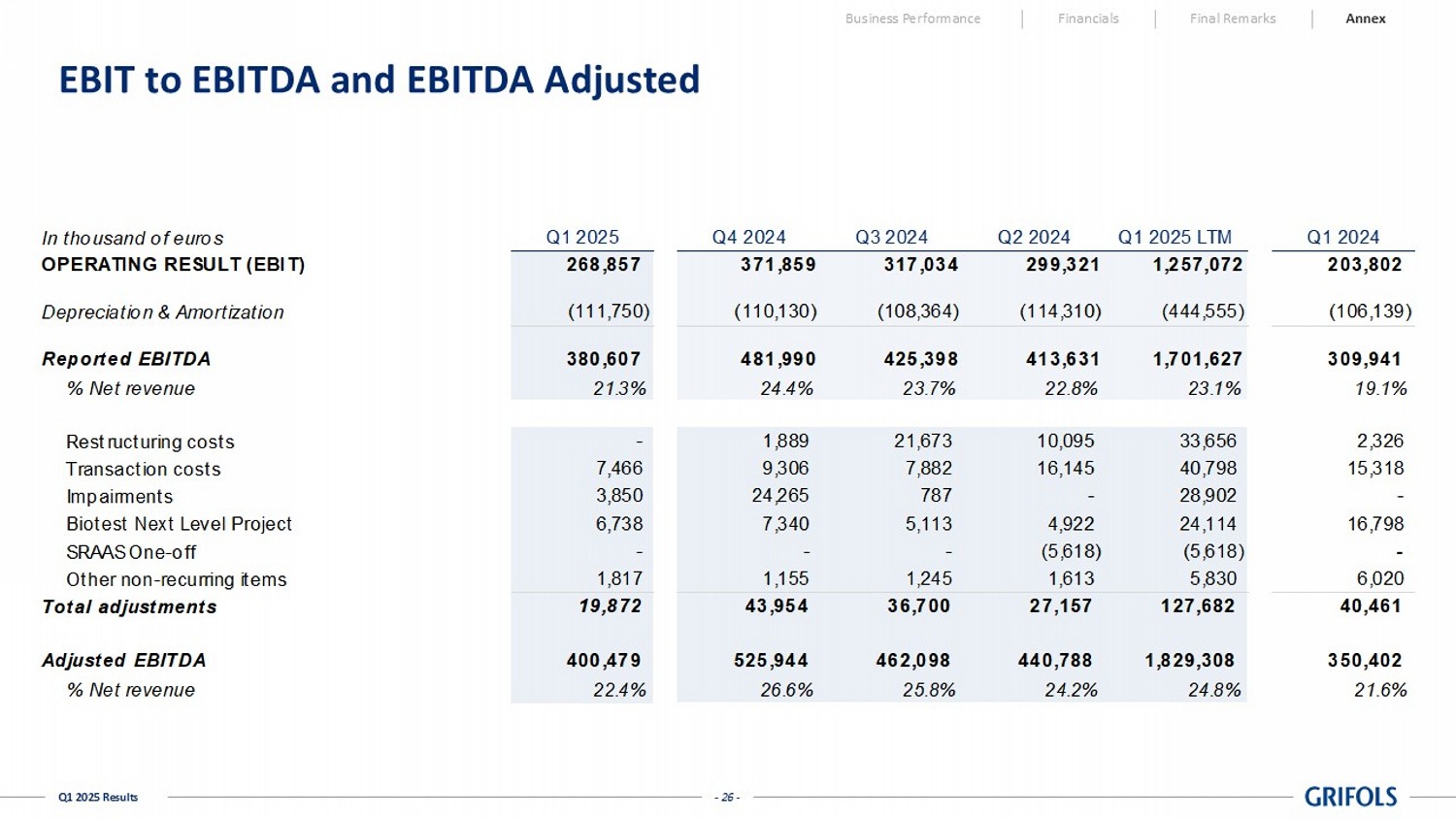 -26日-2025年第一季度业绩息税前利润与EBITDA和EBITDA调整后经营业绩财务最终备注附件单位:千欧元268,857371,859317,034299,3211,257,072203,802(111,750)(110,130)(108,364)(114,310)(444,555)(106,139)报告EBITDA 380,607481,990425,398413,6311,701,627309,941%净营收21.3% 24.4% 23.7% 22.8% 23.1% 19.1%重组成本-1,88921,67310,09533,6562,326交易成本7,4669,3067,88216,14540,79815,318减值3,85024,265787-28,902-Biotest Next Level Project 6,7387,调整后EBITDA 400,479525,944462,098440,7881,829,308350,402%净营收22.4% 26.6% 25.8% 24.2% 24.8% 21.6% Q1 2024Q1 2025Q2 2024Q1 2025LTMQ3 2024Q4 2024折旧和摊销经营业绩(EBIT)