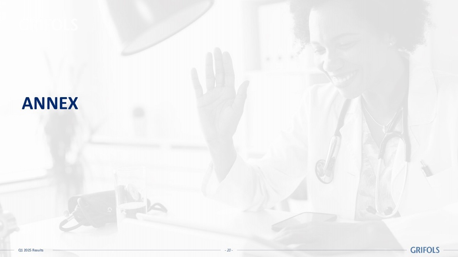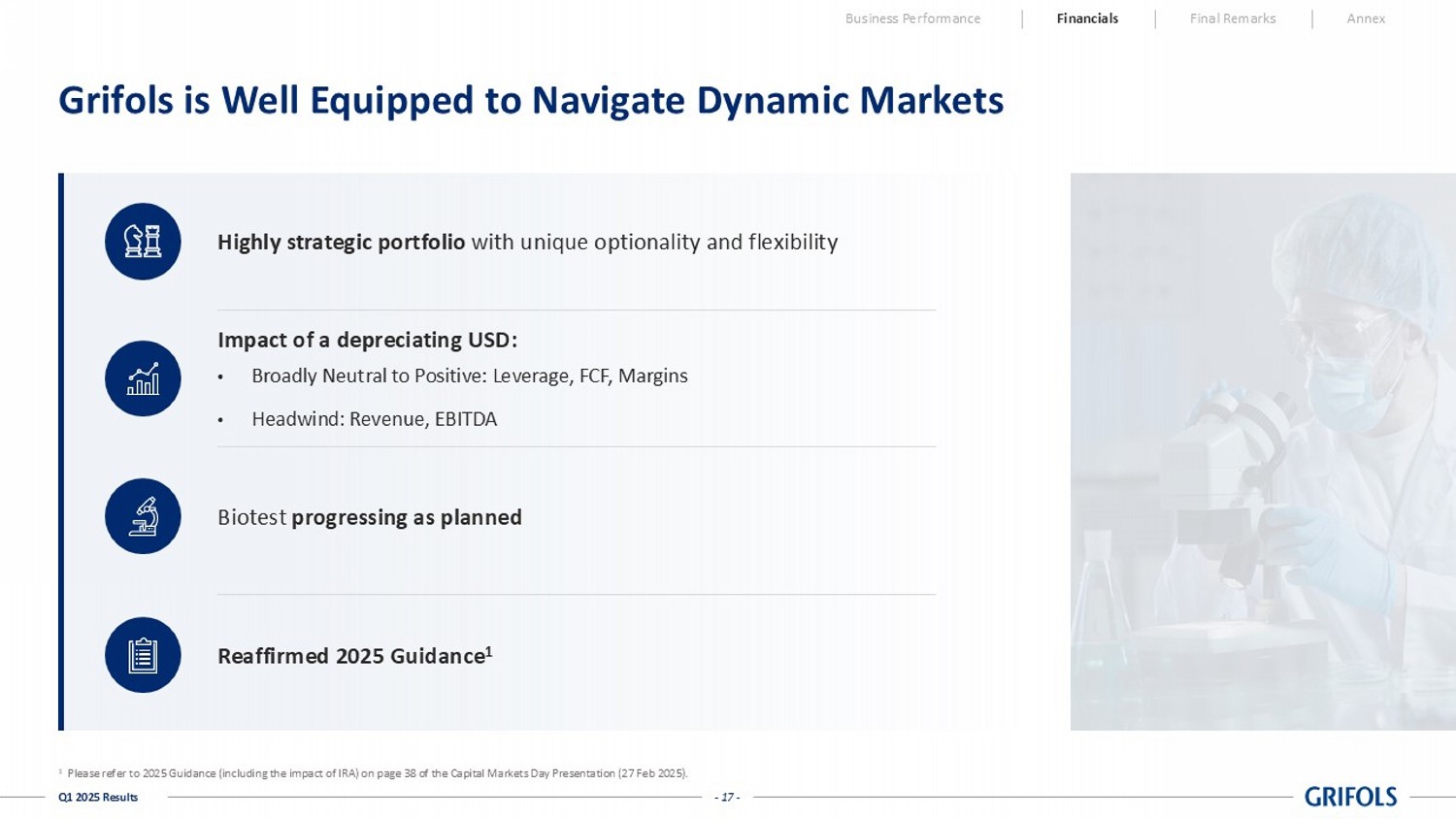 -17日-2025年第一季度业绩Grifols有能力驾驭动态市场业务表现财务最后评论附件具有独特选择性和灵活性的高度战略性投资组合Biotest按计划进展重申了2025年指导1美元贬值的影响:•大致中性至正面:杠杆、FCF、利润率•逆风:收入、EBITDA 1请参阅资本市场日报告(2025年2月27日)第38页的2025年指导(包括IRA的影响)。
