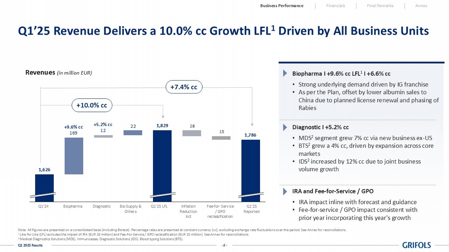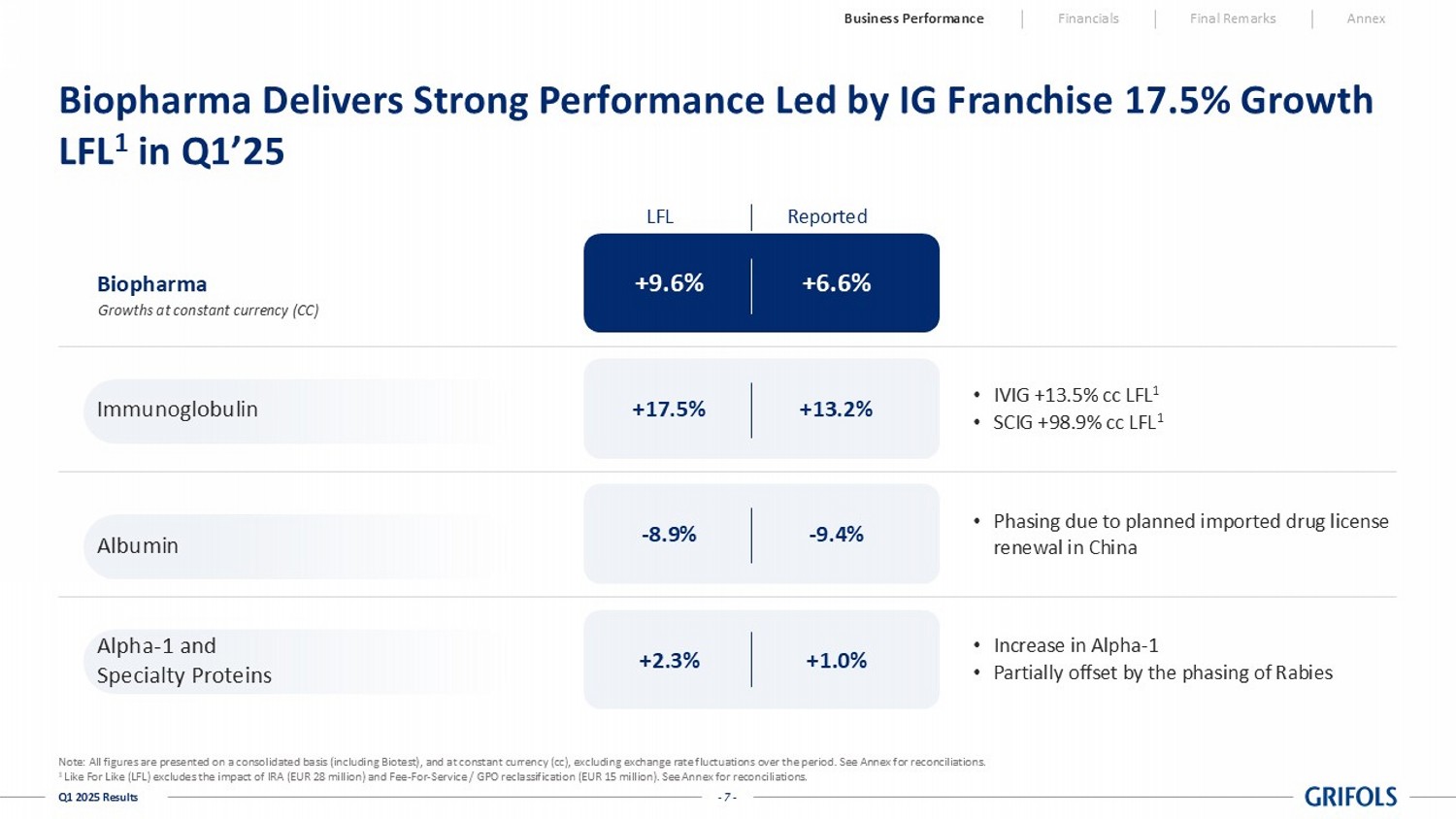 -6-2025年第一季度业绩Q1’25收入在所有业务部门的推动下实现了10.0%的CC增长LFL 1注:所有数据均以综合基础(包括Biotest)列报。百分比费率以恒定ncy(CC)表示,不包括该期间的汇率波动。调节见附件。1 Like for Like(LFL)不包括IRA(2800万欧元)和Fee-for-Service/GPO重新分类(1500万欧元)的影响。调节见附件。2医疗诊断解决方案(MDS)。免疫分析诊断解决方案(IDS)。血液分型解决方案(BTS)。收入(百万欧元)1,6261,82912345678 Q1’24 Biopharma Diagnostic Bio Supply & Others Q1’25 LFL Fee-for-S Service/GPO Resclassification Q1’25 Reported Inflation Reduction Act 1,786 + 9.6% CC 169 + 5.2% CC 12221528 + 10.0% CC + 7.4% CC Business Performance Financials Final Remarks Annex Biopharma I + 9.6% CC LFL 1 I + 6.6% CC •由IG特许经营权推动的强劲潜在需求•按照计划,由于计划更新许可证和分阶段推出狂犬病诊断I + 5.2% CC • MDS 2部门通过新业务(不包括美国)增长7% CC • BTS 2增长4% CC,受跨核心市场扩张推动• IDS 2增长12% CC,原因是联合业务量增长IRA和按服务收费/GPO • IRA影响符合预测和指导•按服务收费/GPO影响与上一年一致,包含今年的增长