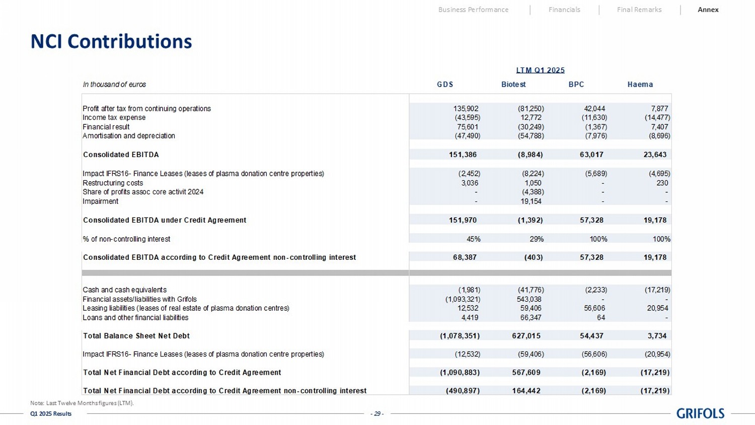 -29日-2025年第一季度业绩NCI贡献业务业绩财务最终备注附件(单位:千欧元)GDS Biotest BPC Haema持续经营业务税后利润135,902(81,250)42,0447,877所得税费用(43,595)12,772(11,630)(14,477)财务业绩75,601(30,249)(1,367)7,407摊销及折旧(47,490)(54,788)(7,976)(8,696)合并EBITDA 151,386(8,984)63,01723,643影响IFRS16-融资租赁(血浆捐赠中心物业的租赁)(2,452)(8,224)(5,689)(4,695)重组成本3,0361,050-230应占利润assoc core activit 2024-(4,388)--减值-19,154--信贷协议下的合并EBITDA 151,970(1,392)57,32819,178%非控股权益45% 29% 100% 100%按信贷协议下的合并EBITDA非控股权益68,387(403)57,32819,178现金及现金等价物(1,981)(41,776)(2,233)(17,219)与Grifols的金融资产/负债(1,093,321)543,038--租赁负债(血浆捐赠中心不动产租赁)12,53259,40656,60620,954贷款和其他金融负债4,41966,34764-资产负债表净债务总额(1,078,351)627,01554,4373,734影响IFRS16-融资租赁(血浆捐赠中心物业租赁)(12,532)(59,406)(56,606)(20,954)根据信贷协议的金融债务净额总额(1,090,883)567,609(2,169)(17,219)根据信贷协议非控股权益的金融债务净额