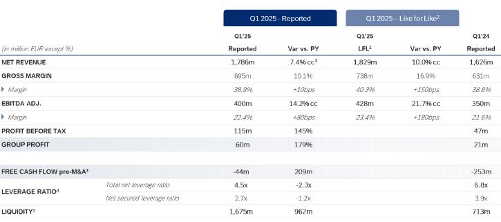 调整后EBITDA增长至4亿欧元(利润率22.4%),增长14.2% CC和21.7% CC LFL。报告EBITDA增长22.6%至3.81亿欧元,利润率增长220个基点至21.3%,显示报告与调整后EBITDA的持续趋同。