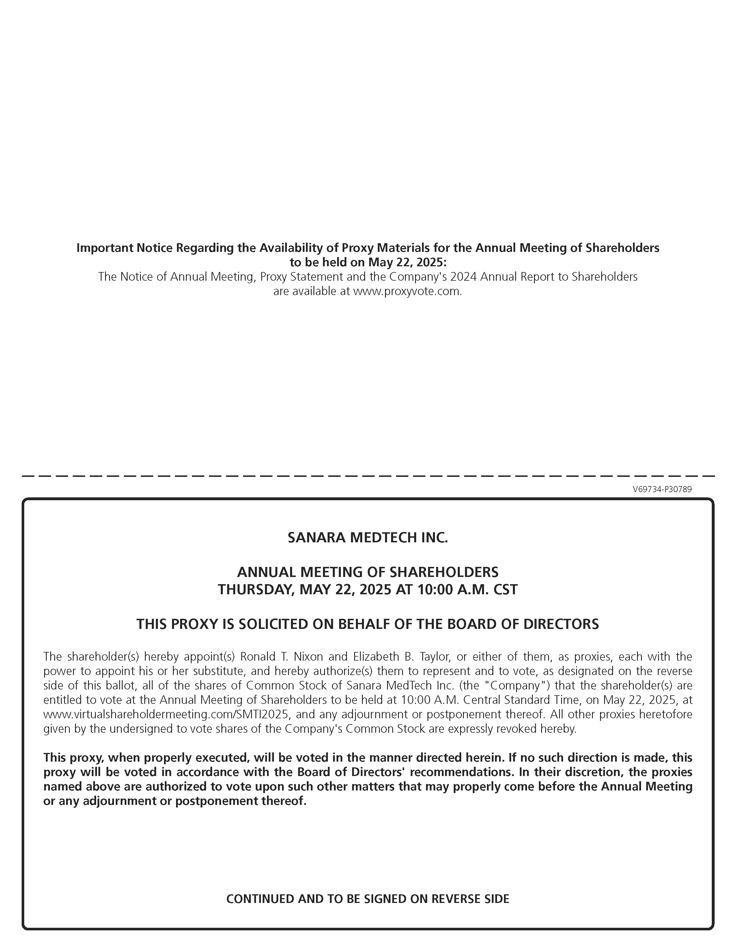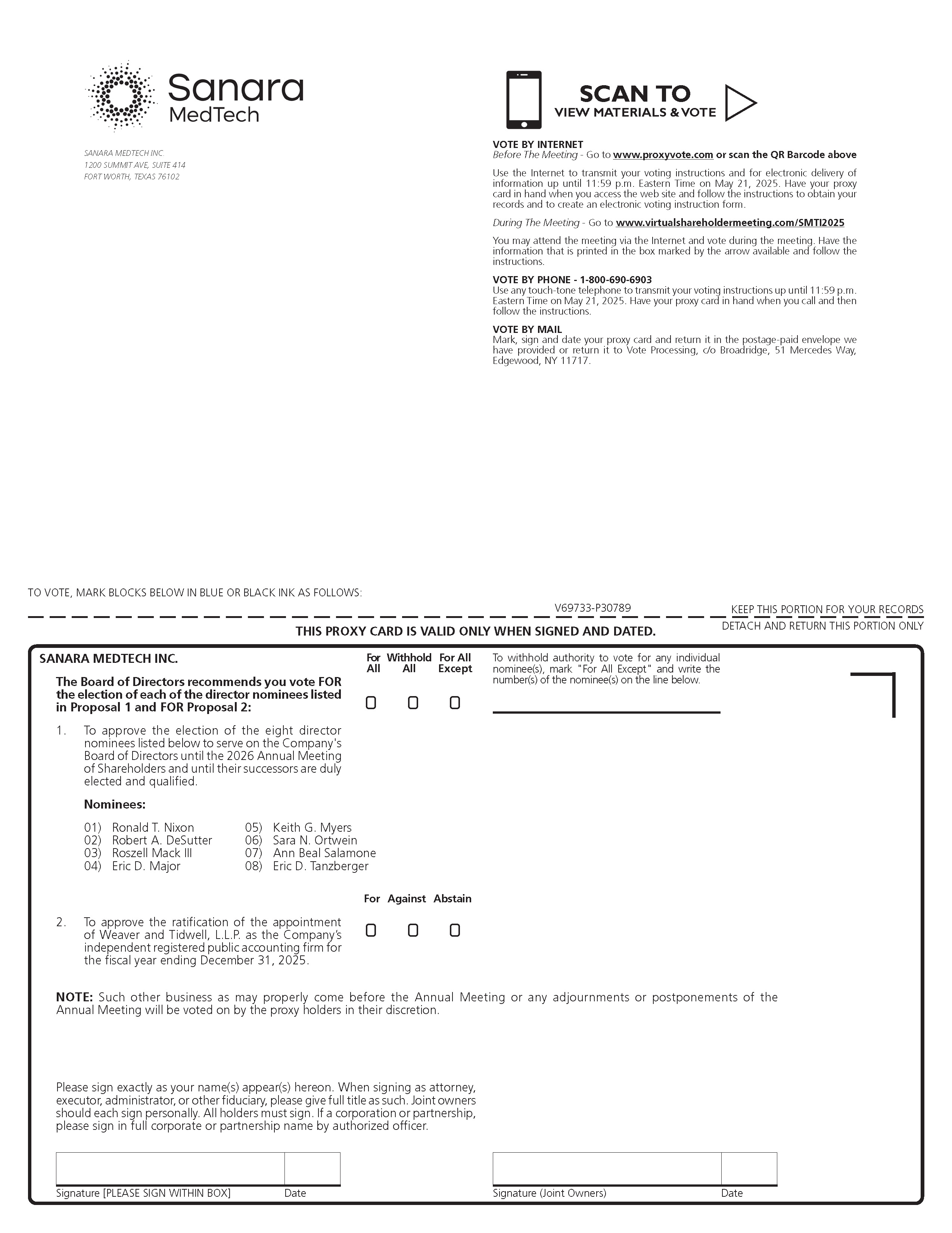 诚邀您参加德克萨斯州公司(“公司”)—— Sanara MedTech Inc.的年度股东大会(“年度会议”)。年会将于美国中部时间2025年5月22日(星期四)上午10时举行。为方便股东出席和参与,我们已确定年会将仅以虚拟会议形式举行,通过互联网,不举行实体面对面会议。