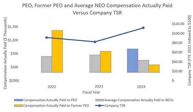 根据S-K条例第402(v)项的要求,我们就过去三个完整日历年的每一年的高管薪酬与我们的财务业绩之间的关系提供以下信息。在确定向我们指定的执行官(“NEO”)“实际支付的薪酬”时,我们需要对薪酬汇总表中报告的金额进行各种调整,因为SEC对这一部分的估值方法与薪酬汇总表中要求的不同。下表汇总了我们的薪酬汇总表中报告的薪酬价值,以及本节要求的2024、2023和2022财政年度的调整后价值。