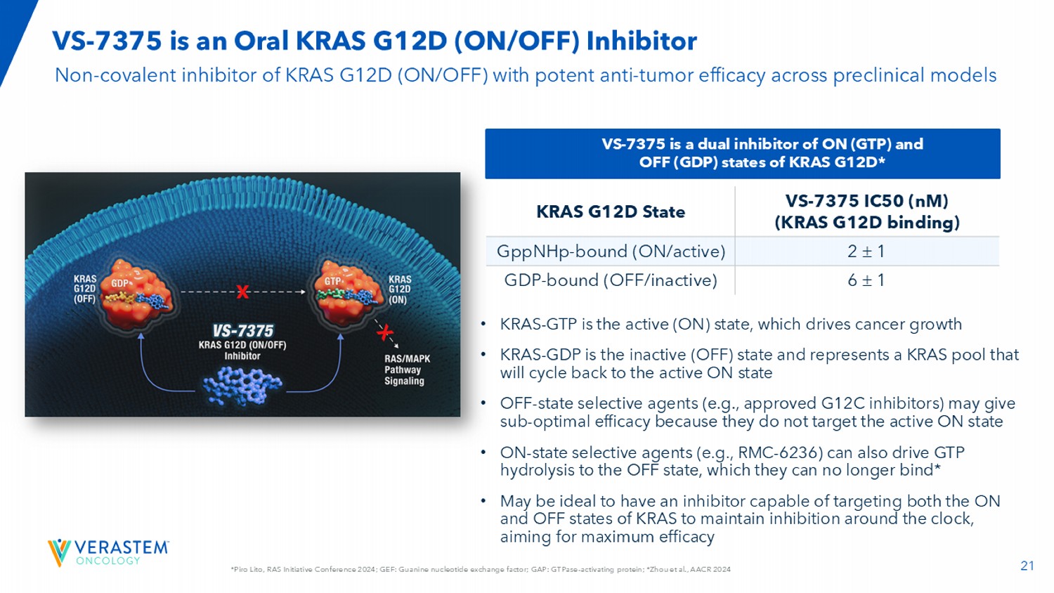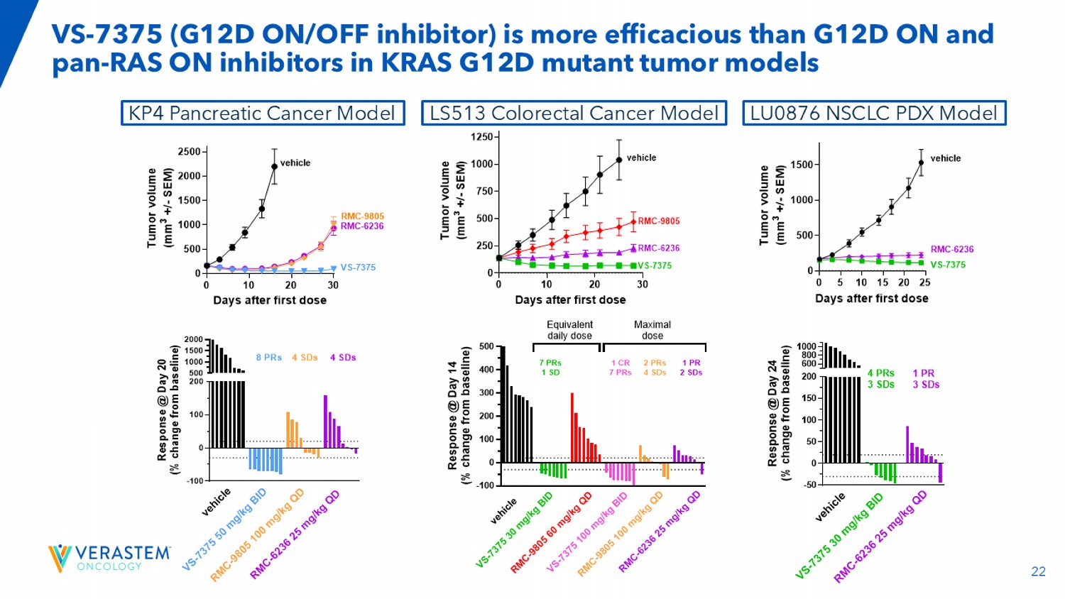 21*Piro Lito,RAS Initiative Conference 2024;GEF:鸟嘌呤核苷酸交换因子;GAP:GTP酶-激活蛋白;*周等人,AACR 2024 VS-7375是一种口服KRAS G12D(ON/OFF)抑制剂VS-7375 IC50(NM)(KRAS G12D结合)KRAS G12D状态21 GPPNHp结合(ON/活性)61 GDP结合(OFF/非活性)VS-7375是KRAS G12D的ON(GTP)和OFF(GDP)状态的双重抑制剂*KRAS G12D(ON/OFF)的非共价抑制剂,跨临床前模型具有有效的抗肿瘤功效• KRAS-GTP为活性(ON)状态,推动癌症增长• KRAS-GDP是非活性(OFF)状态,代表一个KRAS池,它将循环回到活性的ON状态• OFF状态选择剂(例如,已批准的G12C抑制剂)可能会产生次优的疗效,因为它们不针对活性的ON状态• ON状态选择剂(例如,RMC-6236)也可以驱动GTP水解到OFF状态,他们不能再绑定了*•可能理想的是拥有一种能够同时针对KRAS的ON和OFF状态的抑制剂,以全天候保持抑制,以最大的功效为目标