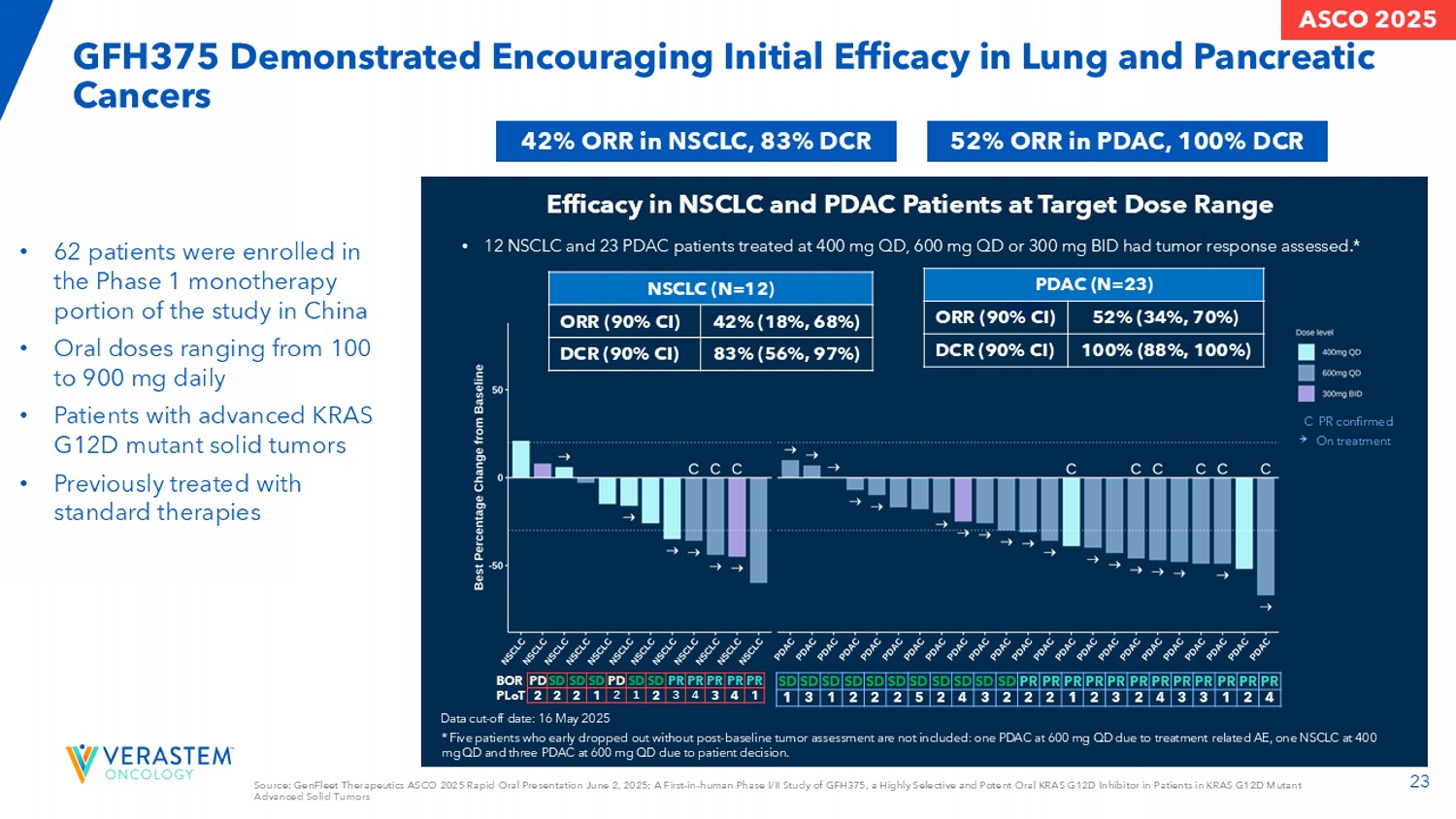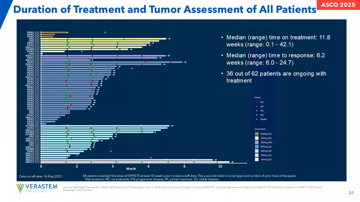 24所有患者的治疗持续时间和肿瘤评估月数据截止日期:2025年5月16日所有患者至少在数据截止日期前10周接受第一剂GFH375。y轴蜱标记为肿瘤类型和先前治疗的线数。简称:NE,不可评估;PD,进行性疾病;PR,p动脉应答;SD,病情稳定。•中位(范围)治疗时间:11.8周(范围:0.1-42.1)•中位(范围)反应时间:6.2周(范围:6.0-24.7)• 62名患者中有36名正在接受治疗来源:GenFleet Therapeutics ASCO 2025快速口头介绍2025年6月2日;GFH375的首次人体I/II期研究,GFH375是一种在KRAS G12D突变晚期实体瘤ASCO 2025患者中的高度选择性d强效口服KRAS G12D抑制剂