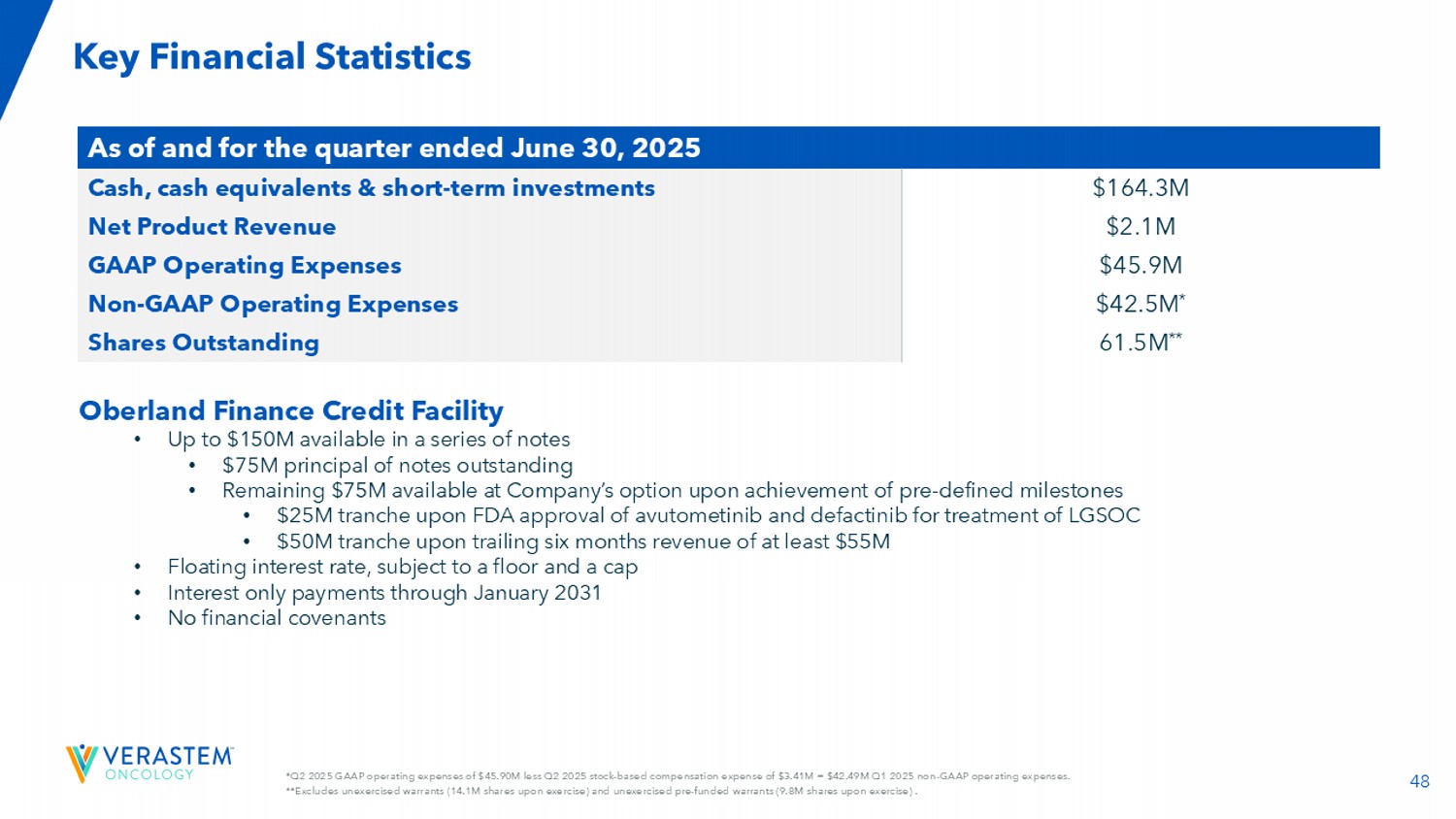 48*2025年第二季度GAAP运营费用4590万美元减去2025年第二季度基于股票的薪酬费用341万美元= 2025年第一季度非GAAP运营费用4249万美元。**不包括未行使的认股权证(行权时1410万股)和未行使的预融资认股权证(行权时980万股)。截至2025年6月30日止季度的主要财务统计数据1.643亿美元现金,现金等价物和短期投资210万美元产品净收入4590万美元GAAP运营费用4250万美元*Non-GAAP运营费用6150万**已发行股票Oberland Finance Credit Facility •高达1.5亿美元可用于一系列票据• 7500万美元未偿票据本金•在实现预先确定的里程碑时,公司可选择剩余的7500万美元•在FDA批准avutometinib和defactinib用于治疗LGSOC时提供2500万美元的分支•在过去六个月收入至少为5500万美元时提供5000万美元的分支•浮动利率,有下限和上限•到2031年1月只支付利息•没有财务契约