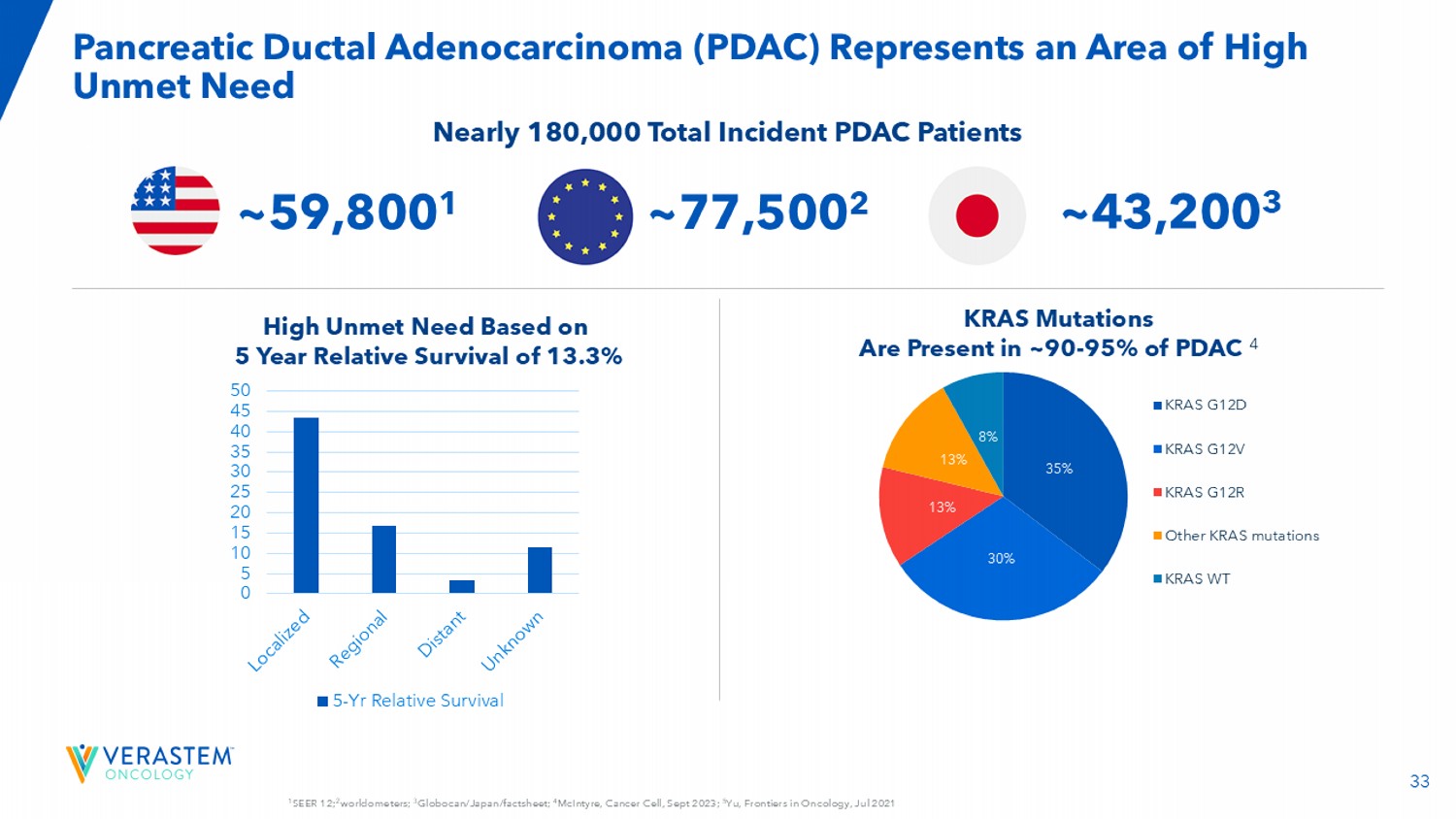 331个SEER 12;2个世界计;3个Globocan/Japan/factsheet;4个McIntyre,Cancer Cell,2023年9月;5个Yu,Frontiers in Oncology,2021年7月胰腺导管腺癌(PDAC)代表了一个高未满足需求的领域05 101520253035404550个5年相对生存期KRAS突变存在于~90-95 %的PDAC 4个基于13.3%的5年相对生存期的高未满足需求近180,000名总事件PDAC患者35% 30% 13% 13% 8% KRAS G12D KRAS G12V KRAS G12R其他KRAS突变KRAS WT-59,8001~43,2003~77,5002