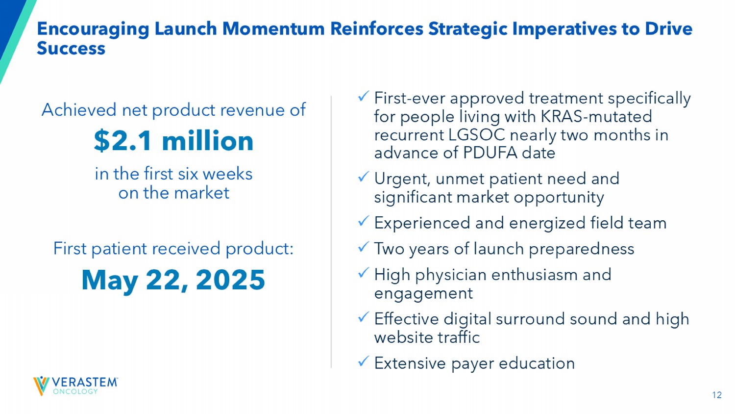 11 Laser-专注于推动成功商业启动的三个战略要务有效覆盖所有医疗保健提供者吸引和支持患者确保无缝访问百强商业医疗保健组织贡献~50%的患者索赔1患者可能已经通过其他疗法取得了进展,许多人将准备好接受新的治疗支持患者以确保消除任何报销障碍环绕声支持计划HCP患者访问1 VSTM DOF –索赔L G SOC Proxy