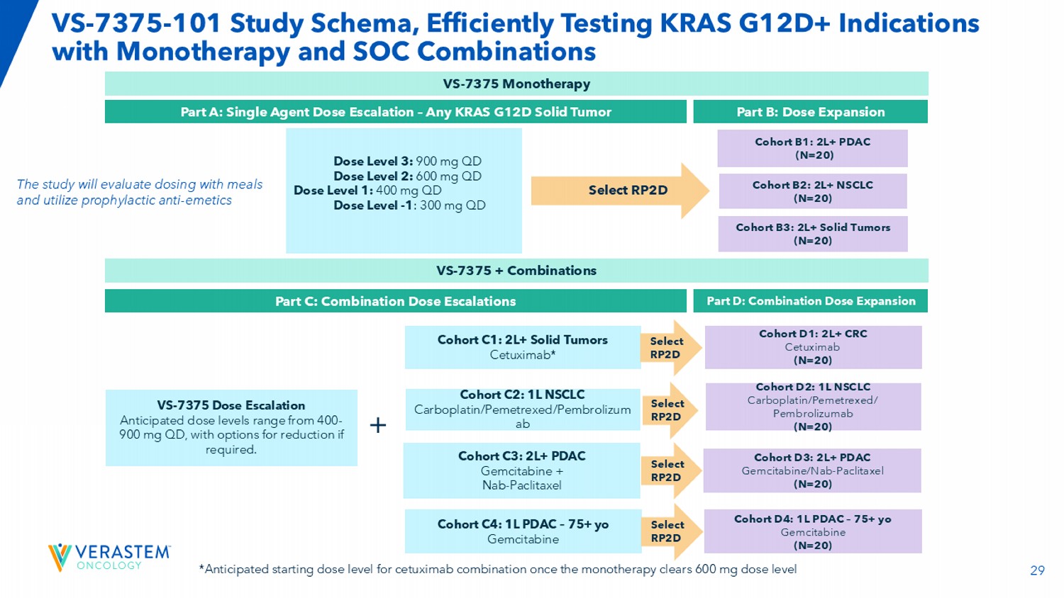 29 VS-7375-101学习图式,单一疗法高效检测KRAS G12D +适应症和SOC组合第A部分:单药剂量递增–任意KRAS G12D实体瘤队列B1:2L + PDAC(N = 20)队列D1:2L + CRC西妥昔单抗(N = 20)VS-7375 +组合第B部分:剂量扩展第C部分:联合剂量递增第D部分:联合剂量扩展剂量第3级:900mg QD剂量第2级:600mg QD剂量第1级:400mg QD剂量水平-1:300mg QD队列B2:2L + NSCLC(N = 20)队列B3:2L +实体瘤(N = 20)VS-7375剂量递增如有需要,可选择减持。+队列C1:2L +实体瘤西妥昔单抗*队列D2:1L NSCLC卡铂/培美曲塞/pembrolizumab(N = 20)选择RPTD选择RPTD队列C3:2L + PDAC吉西他滨+ NAB-紫杉醇队列D3:2L + PDAC吉西他滨/NAB-紫杉醇(N = 20)选择RPTD选择RPTD队列C4:1L PDAC – 75 + yo吉西他滨队列D4:1L PDAC – 75 + yo吉西他滨(N = 20)选择RPTD队列C2:1L NSCLC卡铂/培美曲塞/pembrolizum ab该研究将评估随餐给药并利用预防性止吐药*一旦单一疗法清除600mg剂量水平VS-7375单一疗法,西妥昔单抗联合用药的预期起始剂量水平