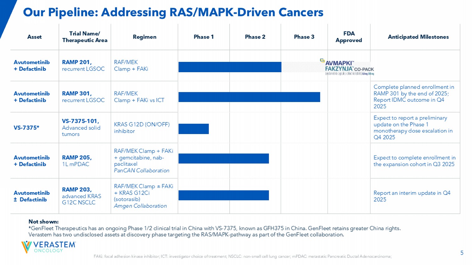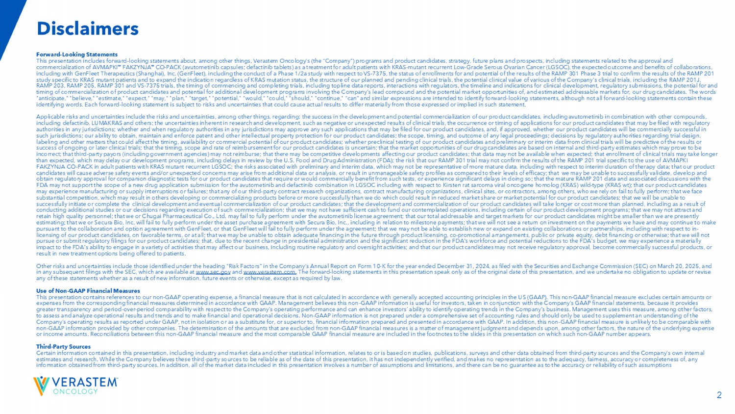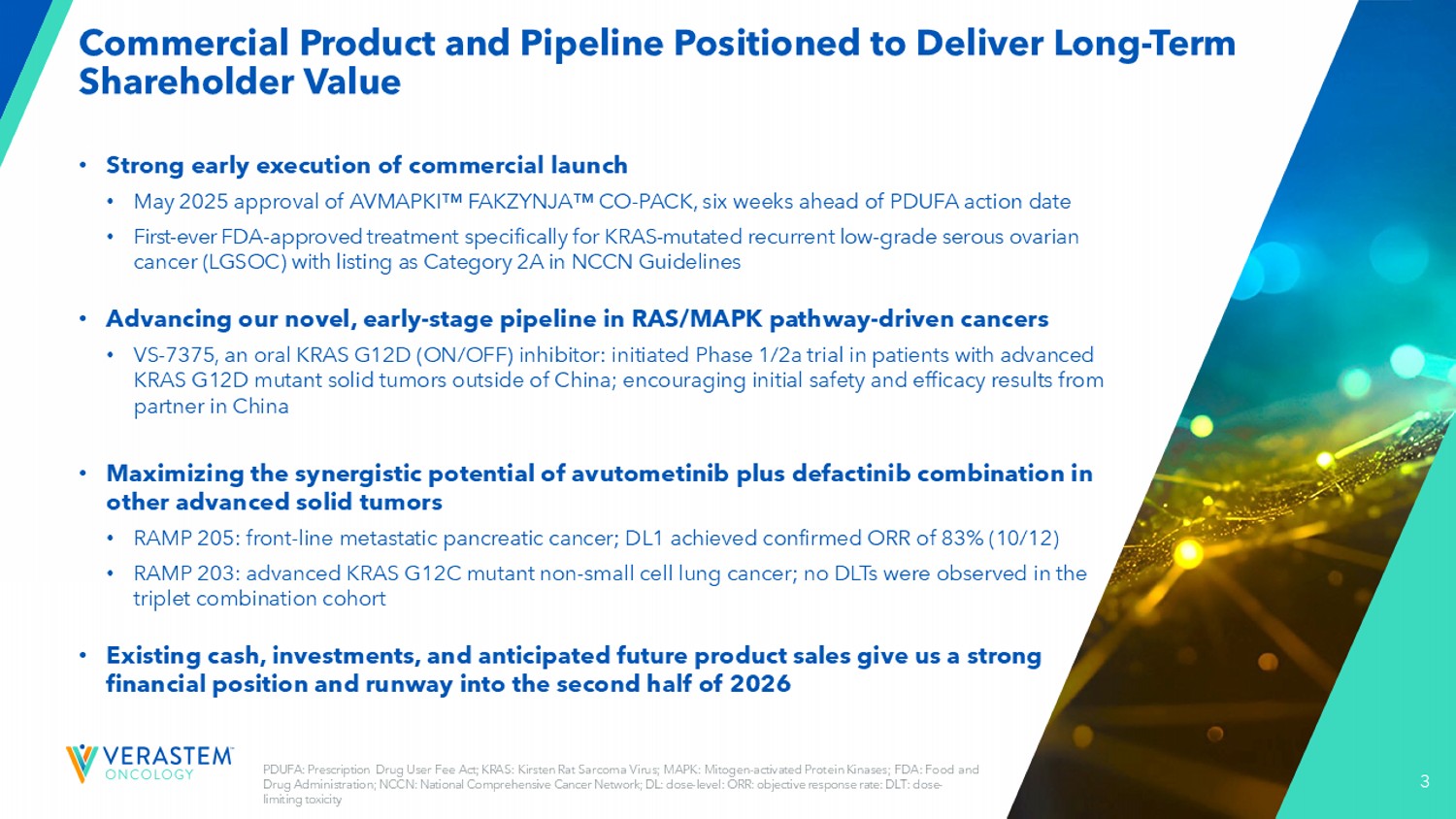 2前瞻性陈述本演示文稿包括有关(其中包括)Verastem肿瘤学(“公司”)的项目和产品候选者、战略、未来计划和前景的前瞻性陈述,包括与AVMAPKI FAKZYNJA CO-PACK(阿伐替尼胶囊;defactinib片)作为KRAS突变复发性低级别浆液性卵巢癌(LGSOC)成人患者的治疗药物的批准和商业化、合作的预期结果和益处,包括与GenFleet Therapeutics(Shanghai),Inc.(GenFleet)的合作,包括开展与VS相关的第1/2a期研究-7375,RAMP 301 3期试验结果的注册状态和潜力,以确认RAMP 201研究特定于KRAS突变患者的结果并扩大适应症,而无论KRAS突变状态如何,我们计划和待进行的临床试验的结构,公司各种临床试验的潜在cl值,包括RAMP 201J、RAMP 203、RAMP 205、RAMP 301和VS-7375试验,开始和完成试验的时间,包括顶线数据报告,与监管机构的互动,临床开发的时间表和适应症、监管提交、候选产品商业化的潜力和时间以及涉及公司的LED化合物的额外开发计划的潜力以及我们的候选药物的潜在市场机会和估计的潜在市场。“预期”、“相信”、“估计”、“预期”、“可能”、“计划”、“目标”、“潜力”、“将”、“可能”、“应该”、“继续”、“可以”和类似表述旨在识别前瞻性陈述,尽管并非所有前瞻性陈述都包含这些识别词。每份前瞻性陈述都受到风险和不确定性的影响,这些风险和不确定性可能导致实际结果与此类陈述中明示或暗示的结果存在重大差异。适用的风险和不确定性包括风险和不确定性,除其他外,涉及以下方面:开发elo pment的成功和我们的候选产品的潜在商业化,包括阿武托替尼与其他化合物联合使用,包括defactinib、LUMAKRAS和其他;研发中固有的不确定性,例如clin ica l试验的阴性或意外结果,可能向任何司法管辖区的监管机构提交的我们的产品候选者申请的发生或时间;任何司法管辖区的监管机构是否以及何时可能批准可能为我们的产品候选者提交的任何此类申请,如果获得批准,我们的产品候选者是否会在这些司法管辖区获得商业成功;我们为我们的pro duc t候选者获得、维护和执行专利和其他知识产权保护的能力;任何法律诉讼的范围、时间和结果;监管机构关于trial de sig n的决定,标签和其他可能影响我们的产品候选者的时间、可用性或商业潜力的事项;Whet她对我们的产品候选者的临床前测试和临床试验的初步或中期数据将预测正在进行或以后的临床试验的结果或成功;时间,我们的产品候选者的报销范围和报销率;我们的候选药物的市场机会是基于内部和第三方的估计,这可能会证明b e不正确;第三方付款人(包括政府机构)可能不会报销;可能存在影响我们的产品候选者的竞争性发展;数据可能无法在预期时获得;临床试验的注册可能会使ger超出预期,这可能会延迟我们的开发计划,包括美国食品药品监督管理局(FDA)的审查延迟;我们的RAMP 301试验可能无法确认RAMP 201试验特定于在KRAS突变复发性LGSOC成人患者中使用AVMAPKI FAKZYNJA CO-PACK的结果的风险;与初步和中期数据相关的风险,这些数据可能不能代表更成熟的数据,包括在治疗持续时间方面的数据;我们的候选产品将导致不良安全性事件和/或额外的数据或分析可能会产生意想不到的担忧,或导致与其功效水平相比无法管理的安全性特征;我们可能无法成功验证,develo p a nd获得监管机构对我们的产品候选者的伴随诊断测试的批准,这些产品候选者需要或将在商业上从此类测试中受益, 或在这样做时遇到重大延误;成熟的RAMP201数据和与FDA的相关讨论可能不支持LGSOC中阿武托替尼和德法替尼组合的新药申请提交范围,包括关于Kirsten大鼠肉瘤病毒癌基因同源物(KRAS)野生型(KRAS wT);我们的候选产品可能会遇到制造或供应中断或故障;我们的任何第三方合同研究组织、c ontract制造组织、临床站点或承包商,其中包括,我们所依赖的人未能充分履行职责;我们面临实质性竞争,这可能导致其他人在我们的产品候选者之前开发或商业化产品或比我们更成功,这可能导致我们的产品候选者的市场份额或市场潜力减少;我们将无法成功启动或完成我们的产品候选者的临床开发和最终商业化;我们的产品候选者的研发和商业化将花费比计划更长的时间或成本更高,包括由于进行了额外的研究或我们关于执行此类商业化的决定;我们可能没有足够的现金为我们的预期运营提供资金,包括我们的某些产品开发方案ram s;我们可能无法吸引和留住高素质的人员;我们或中外制药有限公司可能无法根据阿伏托替尼许可协议充分履行职责;我们的候选产品的总目标和目标市场可能比我们预先估计的要小;我们或Secura Bio,Inc.将无法根据与Secura Bio,Inc.,Inc. luding就里程碑付款达成的资产购买协议充分履行义务;我们将无法看到我们根据与GenFleet的合作和期权协议已有并可能继续进行的付款的投资回报,或者GenFleet将无法根据协议充分履行义务;我们可能无法以优惠条款建立新的或扩大现有合作或合作伙伴关系,包括在我们的候选产品的内部许可方面,或根本没有;我们可能无法通过产品许可、共同促销安排、公共或私募股权、债务融资或其他方式获得足够的融资;我们将不会为我们的产品候选者寻求或提交监管文件;由于最近总统行政当局的变化以及FDA劳动力的显着减少和FDA预算的有力削减,我们可能会对FDA从事可能影响我们业务的各种活动的能力产生重大影响,包括常规监管和监督活动;以及我们
