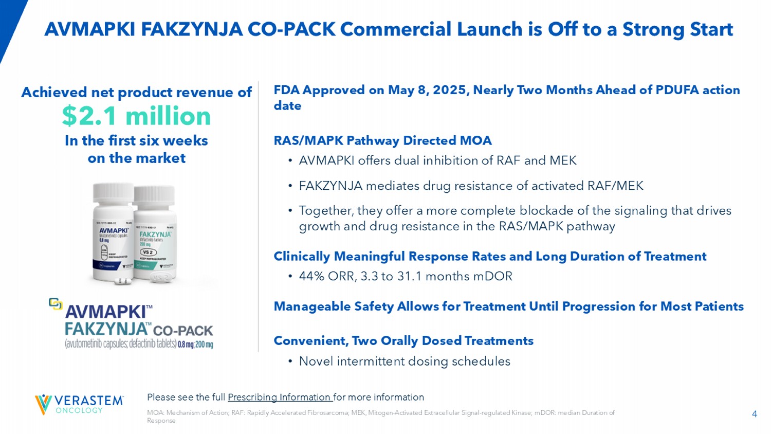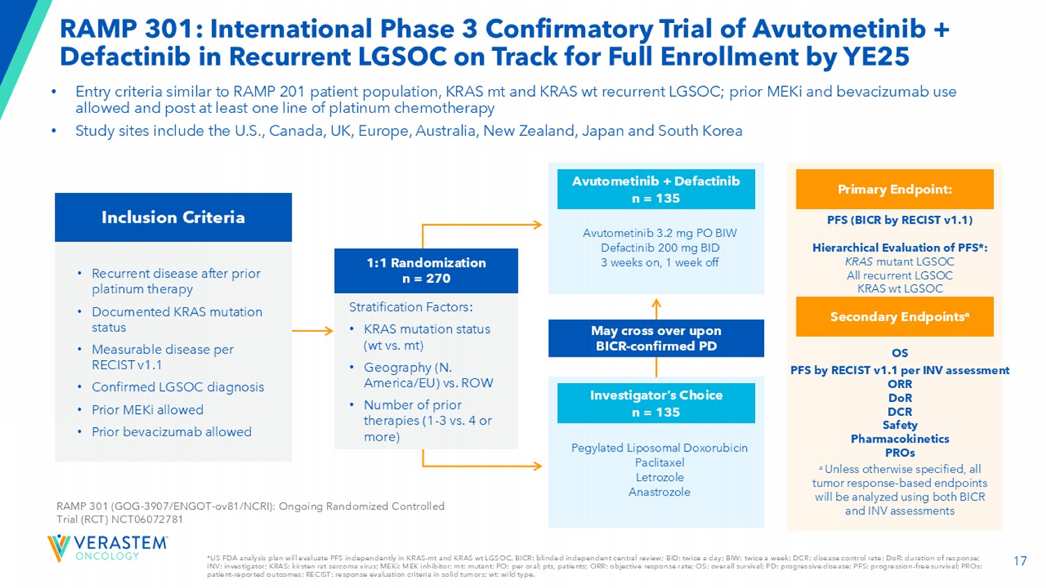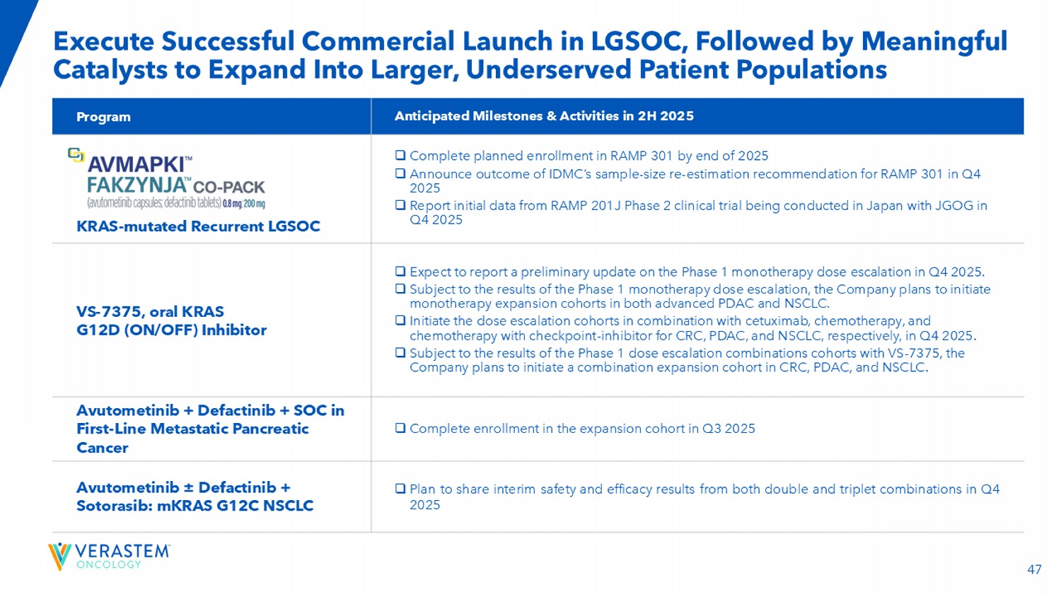 2前瞻性陈述本演示文稿包括有关(其中包括)Verastem肿瘤学(“公司”)的项目和产品候选者、战略、未来计划和前景的前瞻性陈述,包括与AVMAPKI FAKZYNJA CO-PACK(阿伐替尼胶囊;defactinib片)作为KRAS突变复发性低级别浆液性卵巢癌(LGSOC)成人患者的治疗药物的批准和商业化、合作的预期结果和益处,包括与GenFleet Therapeutics(Shanghai),Inc.(GenFleet)的合作,包括开展与VS相关的第1/2a期研究-7375,RAMP 301 3期试验结果的注册状态和潜力,以确认RAMP 201研究特定于KRAS突变患者的结果并扩大适应症,而无论KRAS突变状态如何,我们计划和待进行的临床试验的结构,公司各种临床试验的潜在cl值,包括RAMP 201J、RAMP 203、RAMP 205、RAMP 301和VS-7375试验,开始和完成试验的时间,包括顶线数据报告,与监管机构的互动,临床开发的时间表和适应症、监管提交、候选产品商业化的潜力和时间以及涉及公司的LED化合物的额外开发计划的潜力以及我们的候选药物的潜在市场机会和估计的潜在市场。“预期”、“相信”、“估计”、“预期”、“可能”、“计划”、“目标”、“潜力”、“将”、“可能”、“应该”、“继续”、“可以”和类似表述旨在识别前瞻性陈述,尽管并非所有前瞻性陈述都包含这些识别词。每份前瞻性陈述都受到风险和不确定性的影响,这些风险和不确定性可能导致实际结果与此类陈述中明示或暗示的结果存在重大差异。适用的风险和不确定性包括风险和不确定性,除其他外,涉及以下方面:开发elo pment的成功和我们的候选产品的潜在商业化,包括阿武托替尼与其他化合物联合使用,包括defactinib、LUMAKRAS和其他;研发中固有的不确定性,例如clin ica l试验的阴性或意外结果,可能向任何司法管辖区的监管机构提交的我们的产品候选者申请的发生或时间;任何司法管辖区的监管机构是否以及何时可能批准可能为我们的产品候选者提交的任何此类申请,如果获得批准,我们的产品候选者是否会在这些司法管辖区获得商业成功;我们为我们的pro duc t候选者获得、维护和执行专利和其他知识产权保护的能力;任何法律诉讼的范围、时间和结果;监管机构关于trial de sig n的决定,标签和其他可能影响我们的产品候选者的时间、可用性或商业潜力的事项;Whet她对我们的产品候选者的临床前测试和临床试验的初步或中期数据将预测正在进行或以后的临床试验的结果或成功;时间,我们的产品候选者的报销范围和报销率;我们的候选药物的市场机会是基于内部和第三方的估计,这可能会证明b e不正确;第三方付款人(包括政府机构)可能不会报销;可能存在影响我们的产品候选者的竞争性发展;数据可能无法在预期时获得;临床试验的注册可能会使ger超出预期,这可能会延迟我们的开发计划,包括美国食品药品监督管理局(FDA)的审查延迟;我们的RAMP 301试验可能无法确认RAMP 201试验特定于在KRAS突变复发性LGSOC成人患者中使用AVMAPKI FAKZYNJA CO-PACK的结果的风险;与初步和中期数据相关的风险,这些数据可能不能代表更成熟的数据,包括在治疗持续时间方面的数据;我们的候选产品将导致不良安全性事件和/或额外的数据或分析可能会产生意想不到的担忧,或导致与其功效水平相比无法管理的安全性特征;我们可能无法成功验证,develo p a nd获得监管机构对我们的产品候选者的伴随诊断测试的批准,这些产品候选者需要或将在商业上从此类测试中受益, 或在这样做时遇到重大延误;成熟的RAMP201数据和与FDA的相关讨论可能不支持LGSOC中阿武托替尼和德法替尼组合的新药申请提交范围,包括关于Kirsten大鼠肉瘤病毒癌基因同源物(KRAS)野生型(KRAS wT);我们的候选产品可能会遇到制造或供应中断或故障;我们的任何第三方合同研究组织、c ontract制造组织、临床站点或承包商,其中包括,我们所依赖的人未能充分履行职责;我们面临实质性竞争,这可能导致其他人在我们的产品候选者之前开发或商业化产品或比我们更成功,这可能导致我们的产品候选者的市场份额或市场潜力减少;我们将无法成功启动或完成我们的产品候选者的临床开发和最终商业化;我们的产品候选者的研发和商业化将花费比计划更长的时间或成本更高,包括由于进行了额外的研究或我们关于执行此类商业化的决定;我们可能没有足够的现金为我们的预期运营提供资金,包括我们的某些产品开发方案ram s;我们可能无法吸引和留住高素质的人员;我们或中外制药有限公司可能无法根据阿伏托替尼许可协议充分履行职责;我们的候选产品的总目标和目标市场可能比我们预先估计的要小;我们或Secura Bio,Inc.将无法根据与Secura Bio,Inc.,Inc. luding就里程碑付款达成的资产购买协议充分履行义务;我们将无法看到我们根据与GenFleet的合作和期权协议已有并可能继续进行的付款的投资回报,或者GenFleet将无法根据协议充分履行义务;我们可能无法以优惠条款建立新的或扩大现有合作或合作伙伴关系,包括在我们的候选产品的内部许可方面,或根本没有;我们可能无法通过产品许可、共同促销安排、公共或私募股权、债务融资或其他方式获得足够的融资;我们将不会为我们的产品候选者寻求或提交监管文件;由于最近总统行政当局的变化以及FDA劳动力的显着减少和FDA预算的有力削减,我们可能会对FDA从事可能影响我们业务的各种活动的能力产生重大影响,包括常规监管和监督活动;以及我们