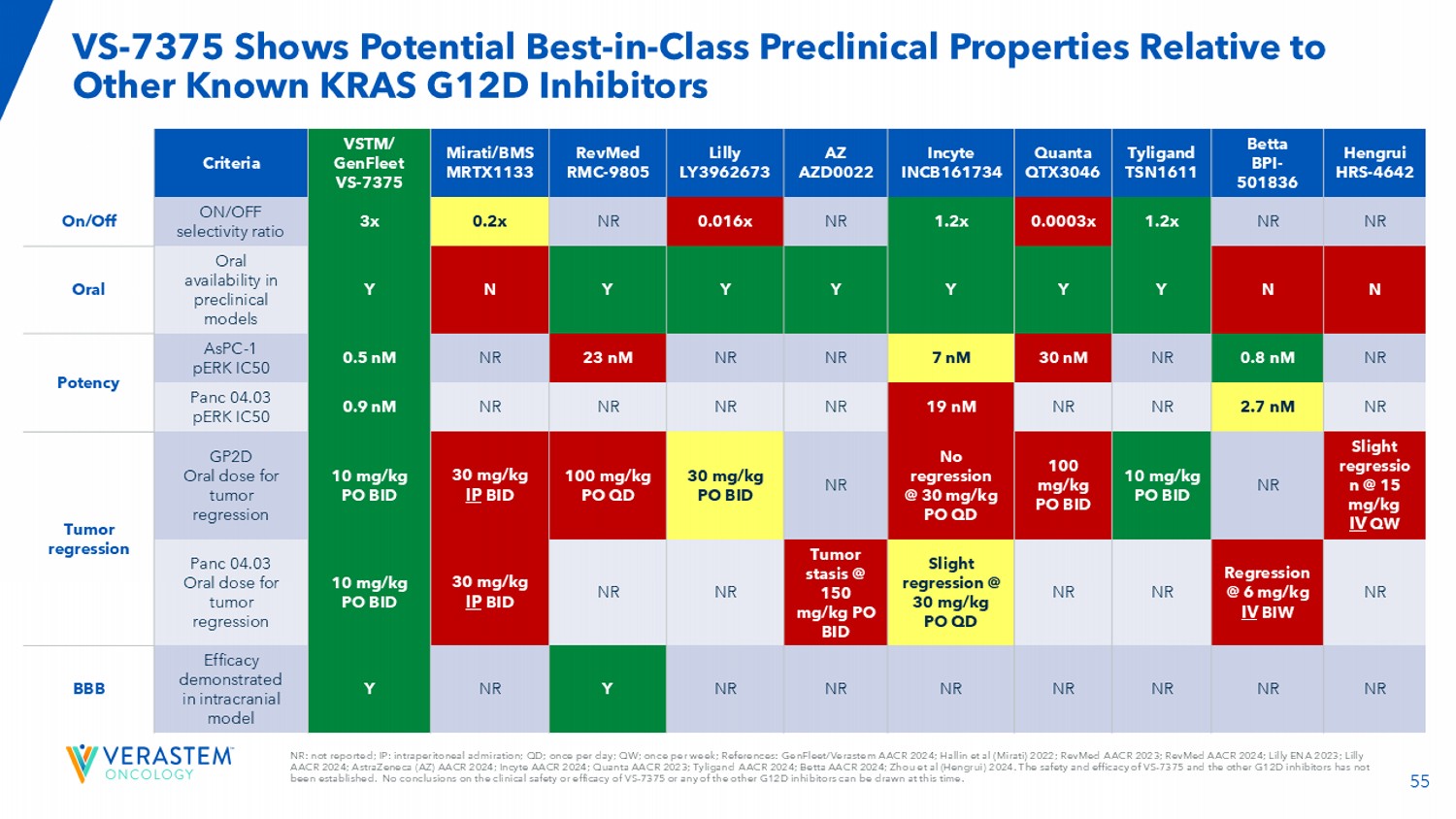 55 NR:未报告;IP:腹膜内钦佩;QD;每天一次;QW;每周一次;参考文献:GenFleet/Verastem AACR 2024;Hallin et al(Mirati)2022;RevMed AACR 2023;RevMed AACR 2024;Lilly ENA 2023;Lilly AACR 2024;因塞特医疗 AACR 2024;Quanta AACR 2023;Tyligand AACR 2024;Betta AACR 2024;Zhou et al(恒瑞)2024。VS-7375和其他G12D抑制剂的安全性和有效性尚未确定。目前无法就VS-7375或任何其他G12D抑制剂的临床安全性或有效性得出结论。VS-7375相对于其他已知的KRAS G12D抑制剂显示出潜在的同类最佳临床前性能恒瑞HRS-4642 Betta BPI-501836 Tyligand TSN1611 Quanta QTX3046 因塞特医疗 INCB161734 AZ AZD0022 Lilly LY3962673 RevMed RMC-9805 Mirati/BMS MRTX1133丨VSTM丨/GenFleet VS-7375标准NRNRR 1.2x 0.0003x 1.2x NR0.016x NR0.2x 3x开/关选择性比开/关N N Y Y Y Y Y Y Y N Y临床前模型中的口服可用性口服NR0.8 nM NR30 nM 7 nM NR23效价NR2.7 nM NRR NR19 nM NRR NR0.9 nM panc 04.03 pERK IC50轻微回归n @15mg/kg IV QW NR10 mg/kg PO BID 100mg/kg PO BID无回归@30mg/kg PO QD NR30 mg/kg PO BID 100mg/kg PO 丨QD 30mg/kg IP BID 10mg/kg PO BID GPTD口服剂量用于肿瘤消退肿瘤消退NR消退@6mg/kg IV BIW NR NR轻微消退@30mg/kg PO QD肿瘤瘀滞@150mg/kg PO BID NR NR 30mg/kg IP BID10mg/kg PO BID PANC 04.03口服剂量用于肿瘤消退NR NR NR NR NR NR NR Y NR Y在颅内BBB模型中的疗效证明