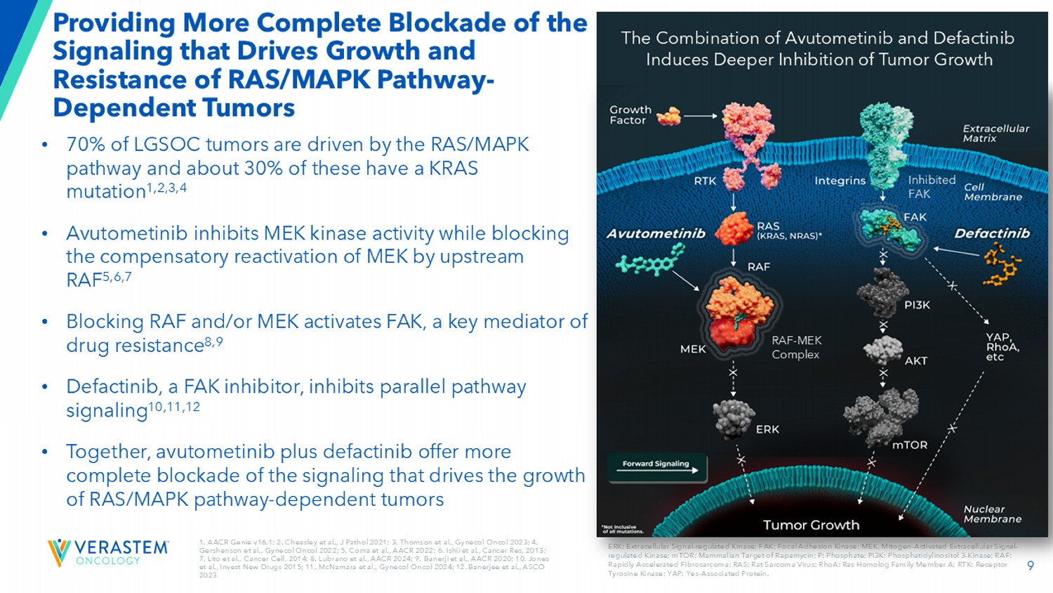 9 1.AACR Genie v16.1;2。Cheasley等,J Pathol 2021;3。Thomson et al.,Gynecol Oncol 2023;4。Gershenson等,Gynecol Oncol 2022;5。Coma et al.,AACR 2022;6。Ishii et al.,Cancer Res,2013;7。Lito et al.,Cancer Cell,2014;8。Lubrano等人,AACR 2024;9。Banerji等人,AACR 2020;10。Jones et al.,invest new drugs 2015;11。McNamara等人,Gynecol Oncol 2024;12。Banerjee等人,ASCO2023提供了更完整的阻断驱动RAS/MAPK通路生长和耐药的信号传导-dependent tumors ERK:胞外信号调节激酶;FAK:局灶性粘附激酶;MEK,丝裂原激活的胞外信号调节激酶;mTOR:Rapamycin的哺乳动物靶点;P:磷酸盐;PI3K:磷脂酰肌醇3-激酶;RAF:快速加速纤维肉瘤;RAS:大鼠肉瘤病毒;RhoA:RAS同源家族成员A;RTK:受体酪氨酸激酶;YAP:是-相关蛋白。• 70%的LGSOC肿瘤由RAS/MAPK通路驱动,其中约30%具有KRAS突变1,2,3,4• Avutometinib抑制MEK激酶活性,同时阻断上游RAF对MEK的代偿性再激活5,6,7•阻断RAF和/或MEK可激活FAK-耐药性的关键介质8,9 • Defactinib,一种FAK-抑制剂,可抑制平行通路信号传导10,11,12 •一起,阿伏托替尼加defactinib提供更完整的阻断驱动RAS/MAPK通路依赖性肿瘤生长的信号RAF-MEK复合物抑制FAKAvutometinib和defactinib联合诱导更深的抑制肿瘤生长