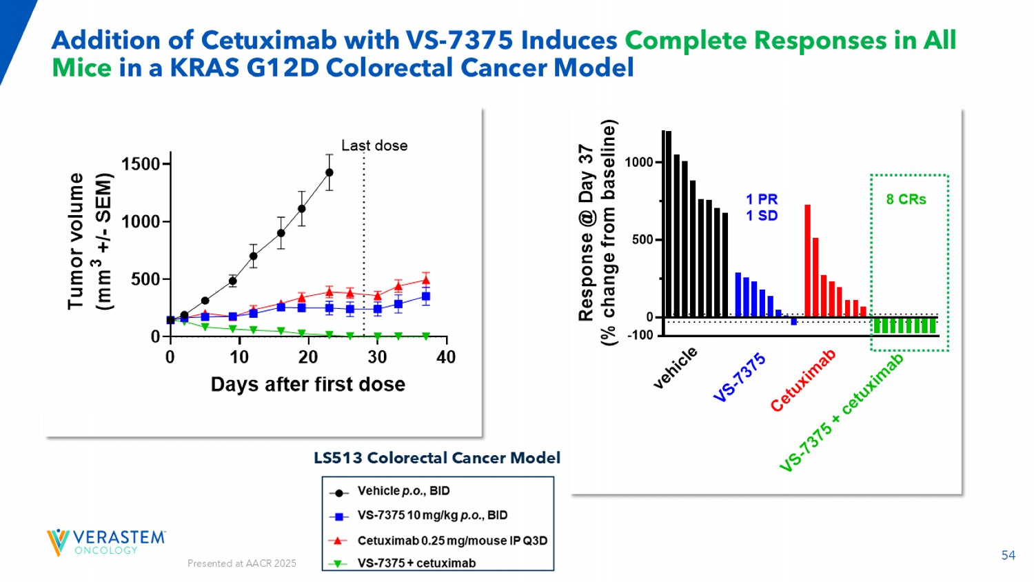 54在KRAS G12D结直肠癌模型LS513结直肠癌模型中添加VS-7375的西妥昔单抗诱导所有小鼠的完全反应010203040050010001500肿瘤生长天数首剂后T u m o r v o l u m e(m m 3 +/-s e m)载体GFH375西妥昔单抗GFH375 +西妥昔单抗最后一剂05001000 R e s p o n s e @ d a y 37(% c h a n g e f r o m b a s e i n e)v e h i c l e v s-7 375 c e t u x i m a b v s-7 375 + c e t u x i m a b 1 PR 1 SD 8 CRs-100在AACR 2025上发表