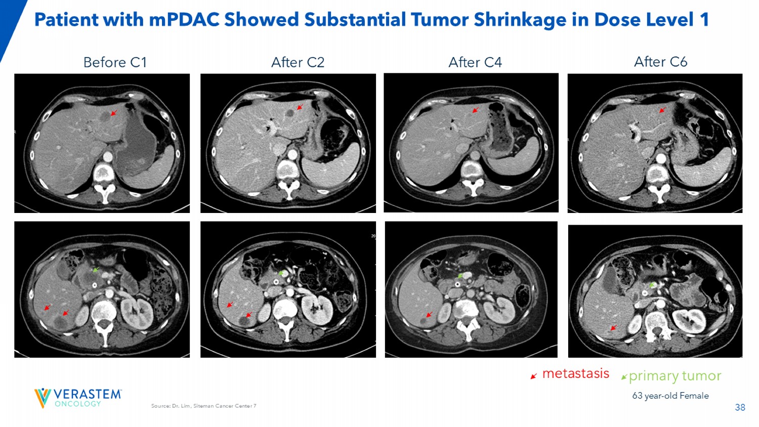 38来源:Siteman癌症中心Lim医生7名mPDAC患者在C6转移原发性肿瘤C4后C2后C1前剂量水平1显示肿瘤明显缩小63岁女性
