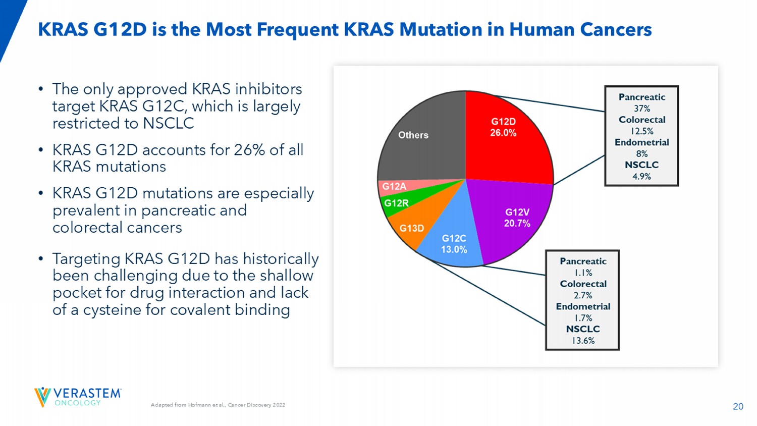 20改编自Hofmann等人,Cancer Discovery 2022 •唯一获批的KRAS抑制剂靶向KRAS G12C,主要局限于NSCLC • KRAS G12D占所有KRAS突变的26% • KRAS G12D突变在胰腺癌和结直肠癌中尤其普遍•靶向KRAS G12D历来具有挑战性,因为药物相互作用的口袋较浅,且缺乏用于共价结合的半胱氨酸KRAS G12D是人类癌症中最常见的KRAS突变