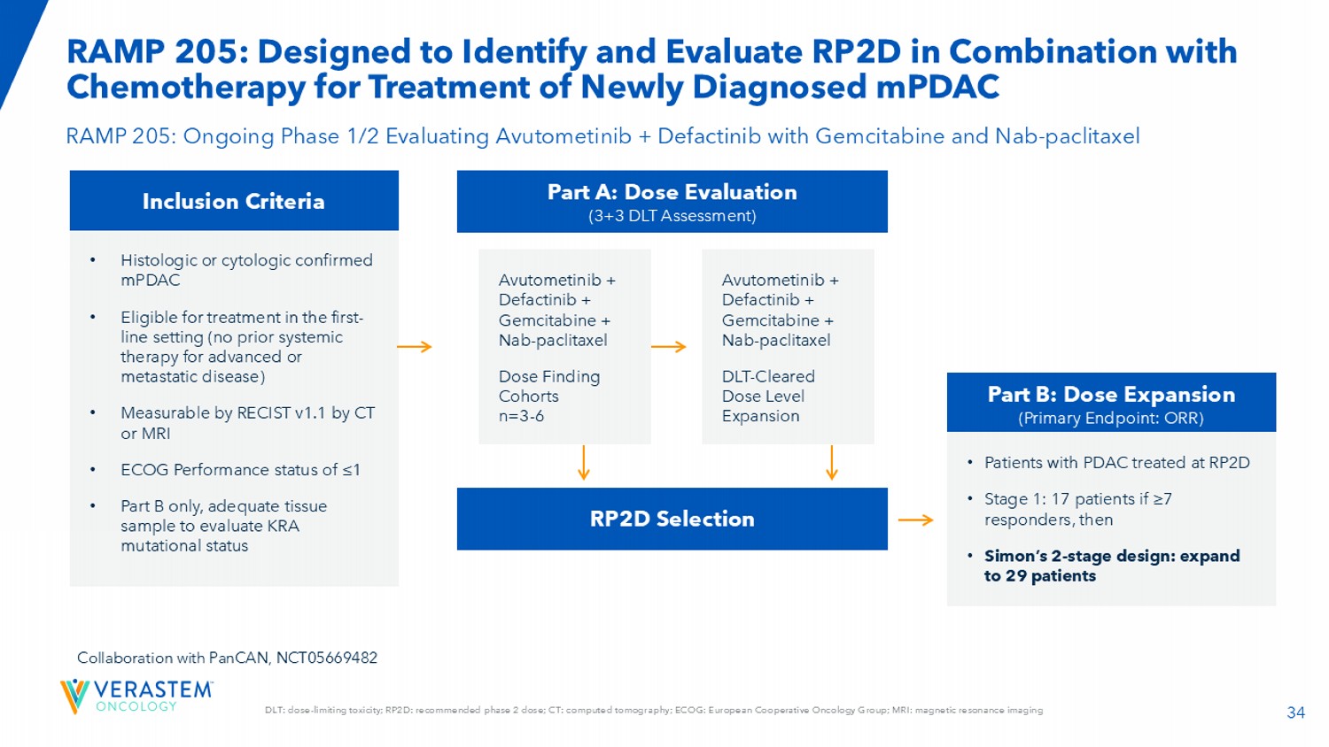 34 DLT:剂量限制性毒性;RPTD:推荐的2期剂量;CT:计算机断层扫描;ECOG:欧洲合作肿瘤学小组;MRI:磁共振成像RAMP 205:旨在识别和评估RPTD联合化疗治疗新诊断的mPDAC RAMP 205:正在进行的1/2期评估阿伏托替尼+ Defactinib联合吉西他滨和NAB-紫杉醇纳入标准•组织学或细胞学证实的mPDAC •符合一线治疗条件(既往未对晚期或转移性疾病进行全身治疗)•可通过RECIST v1.1通过CT或MRI测量• ECOG性能状态≤ 1 •仅B部分,有足够的组织样本来评估与PanCAN的KRA突变状态协作,NCT05669482 Part A:Dose Evaluation(3 + 3 DLT Assessment)RPTD Selection Part B:Dose Expansion(Primary Endpoint:ORR)Avutometinib + Defactinib + Gemcitabine + NAB-紫杉醇剂量发现队列n = 3-6 avutometinib + Defactinib + Gemcitabine + NAB-紫杉醇DLT-Cleared Dose Level Expansion • PDAC患者在RPTD接受治疗•1期:17患者如果≥ 7有应答,那么• Simon的2期设计:扩大到29名患者