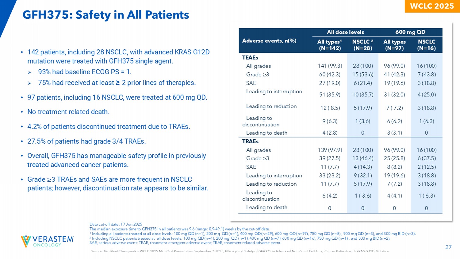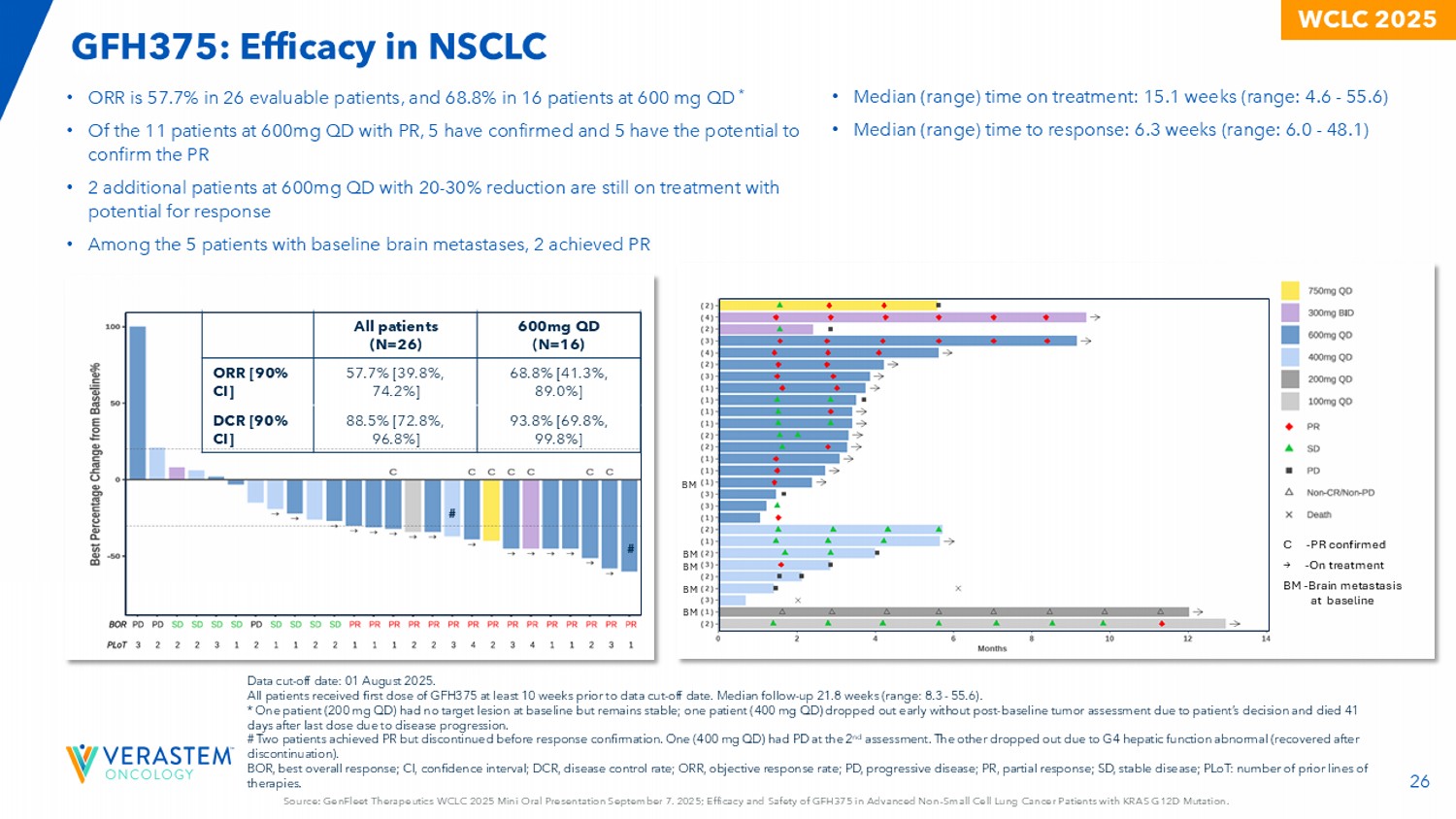 26来源:GenFleet Therapeutics WCLC 2025迷你口头报告9月7日。2025;GFH375在KRAS G12D突变的晚期N对小细胞肺癌患者中的疗效和安全性。WCLC2025 600mg QD(N = 16)所有患者(N = 26)68.8% [ 41.3%,89.0% ] 57.7% [ 39.8%,74.2% ] ORR [ 90% CI ] 93.8% [ 69.8%,99.8% ] 88.5% [ 72.8%,96.8% ] DCR [ 90% CI ] • ORR在26名可评估患者中为57.7%,在600 mg QD时为68.8%*•在11例600mg QD PR患者中,5例已确诊,5例有可能确认PR •另有2例600mg QD且降低20-30 %的患者仍在接受治疗,可能有反应•在5例基线脑转移患者中,2例达到PR # # •中位(范围)治疗时间:15.1周(范围:4.6-55.6)•中位(范围)反应时间:6.3周(范围:6.0-48.1)C-PR确诊→-治疗BM-基线BM BM BM BM时脑转移数据截止日期:2025年8月1日。所有患者至少在数据截止日期前10周接受第一剂GFH375。中位随访-随访21.8周(范围:8.3-55.6)。*1名患者(200mg QD)在基线时无目标病变但保持稳定;1名患者(400mg QD)因患者决定未进行基线后肿瘤评估而提前退出,并因疾病进展在最后一次给药后41天后死亡。#两名患者实现PR,但在反应确认前停用。1例(400mg QD)在第2次评估时发生PD。另一例因G4肝功能异常退出(停药后康复)。BOR,最佳总应答;CI,置信区间;DCR,疾病控制率;ORR,客观应答率;PD,进行性di sease;PR,部分应答;SD,疾病稳定;PLOT:既往治疗线数。GFH375:在NSCLC中的疗效